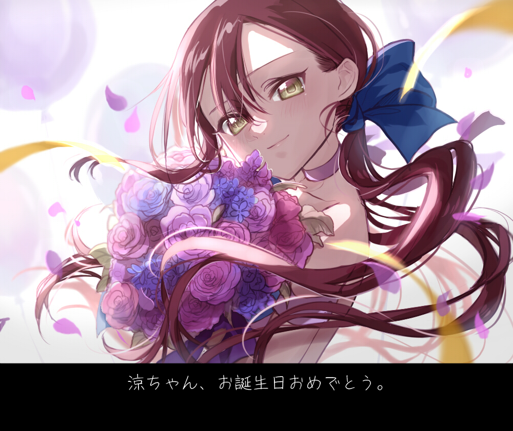1girl aikawa_ryou_(love_live!) bare_shoulders blue_bow blue_flower blush bouquet bow choker commentary falling_petals floating_hair flower green_eyes hair_between_eyes hair_bow happy_birthday holding holding_bouquet koyoru-f long_hair looking_at_viewer love_live! love_live!_school_idol_festival petals purple_choker purple_flower red_hair smile solo upper_body