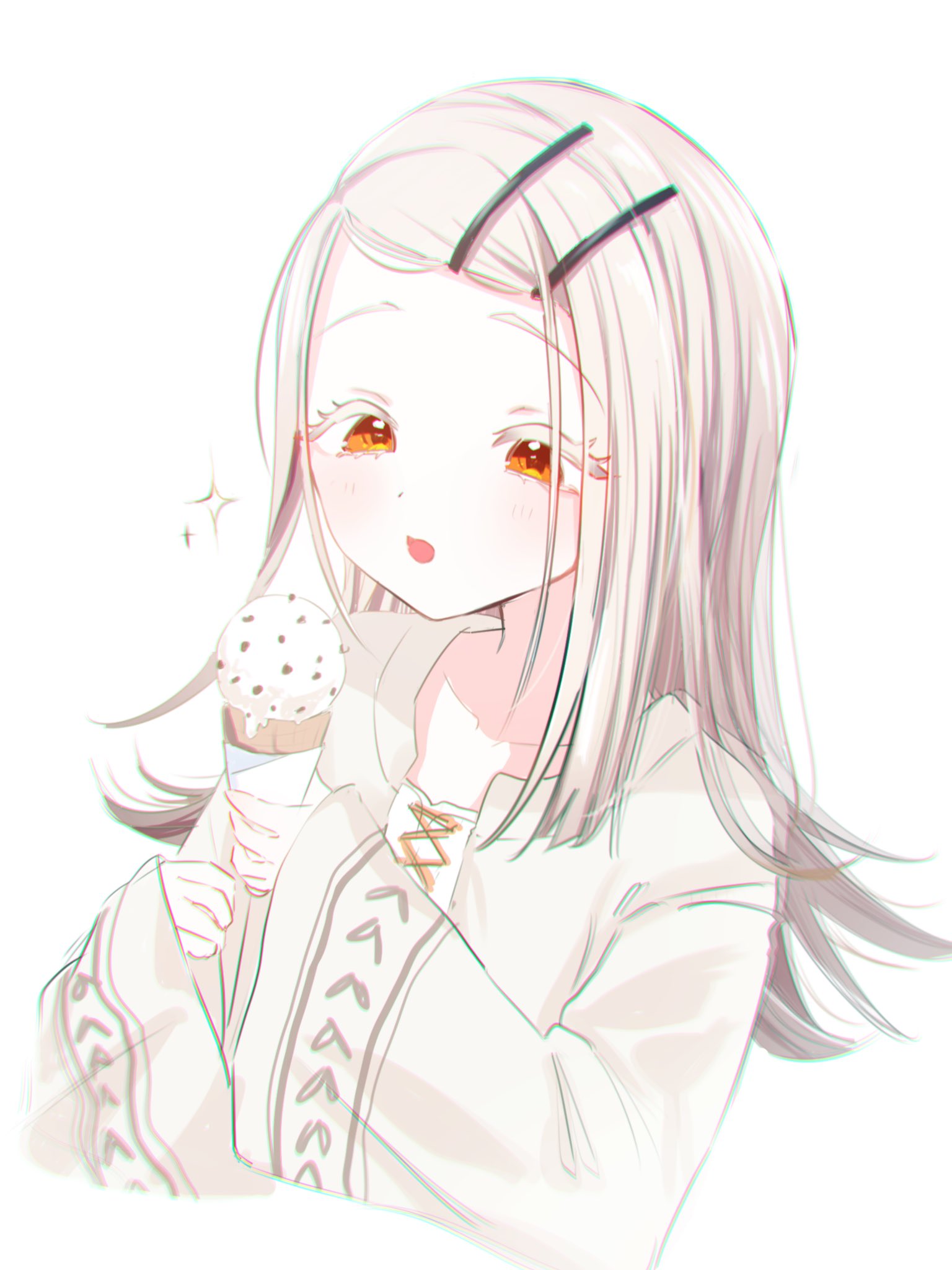 1girl blush food gakuen_idolmaster gradient_hair grey_hair hair_ornament hairclip highres ice_cream idolmaster jacket long_hair marieshi multicolored_hair open_mouth orange_eyes shinosawa_hiro simple_background sketch solo sparkle upper_body white_background white_hair wide_sleeves