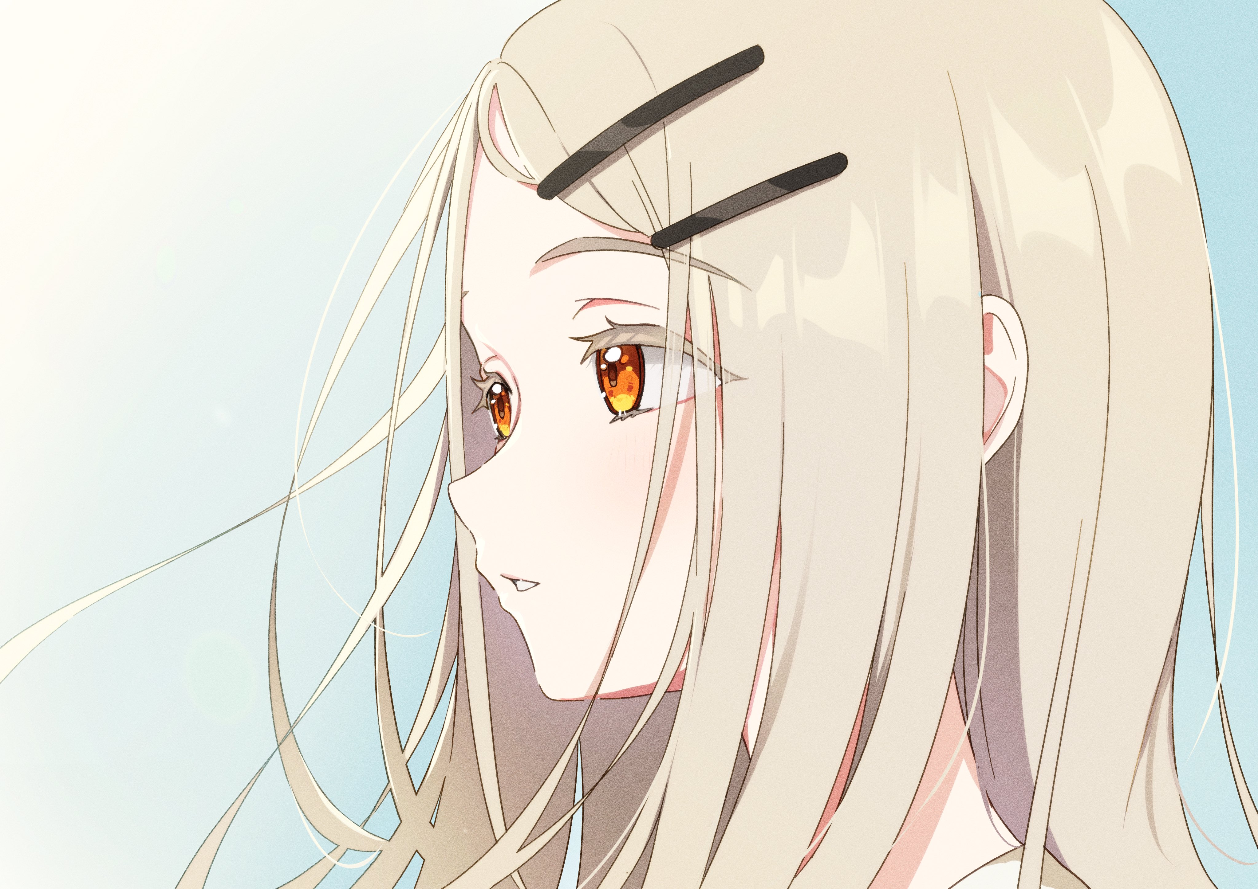 1girl absurdres blush close-up floating_hair gakuen_idolmaster grey_hair hair_ornament hairclip highres idolmaster long_hair looking_to_the_side orange_eyes parallel_hairclips parted_lips profile sasakichi_(ssk_chi) shinosawa_hiro solo wind
