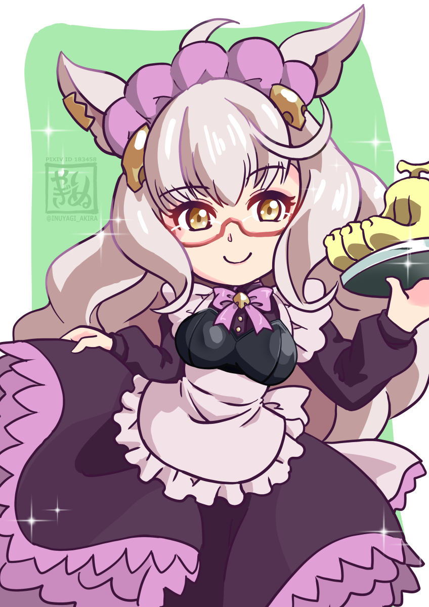 1girl animal_ears apron banana biwa_hayahide_(umamusume) breasts chibi food fruit glasses green_background highres holding holding_tray horse_ears horse_girl inuyagi_akira maid maid_apron maid_headdress medium_breasts red-framed_eyewear signature simple_background smile solo tray twitter_username umamusume white_apron white_background white_hair yellow_eyes