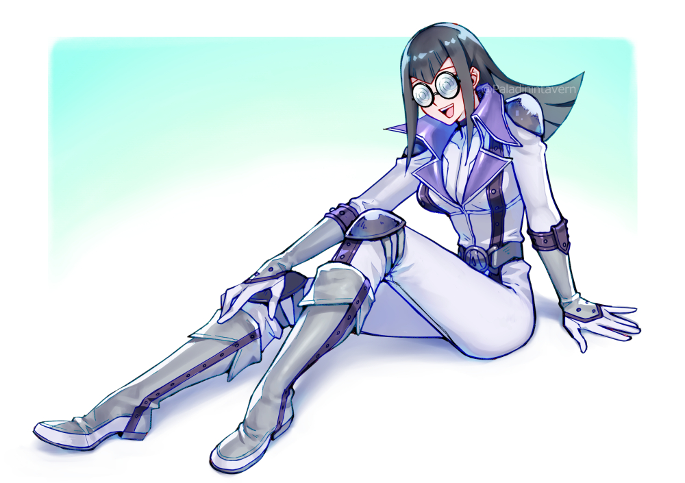 1girl arm_support belt biker_clothes bikesuit black_hair bodysuit boots breasts carly_nagisa coke-bottle_glasses cosplay elbow_pads glasses gloves grey_boots high_collar izapara jack_atlas jack_atlas_(cosplay) knee_pads long_hair medium_breasts open_mouth racing_suit round_eyewear shoulder_pads sitting smile solo teeth tongue upper_teeth_only white_bodysuit yu-gi-oh! yu-gi-oh!_5d's