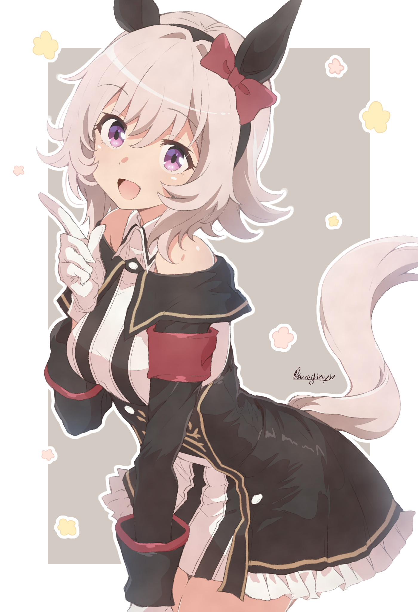 1girl animal_ears artist_name black_dress curren_chan_(umamusume) dress frilled_dress frills gloves highres horse_ears horse_girl horse_tail kannagiray looking_at_viewer off-shoulder_dress off_shoulder short_hair smile solo tail umamusume white_gloves