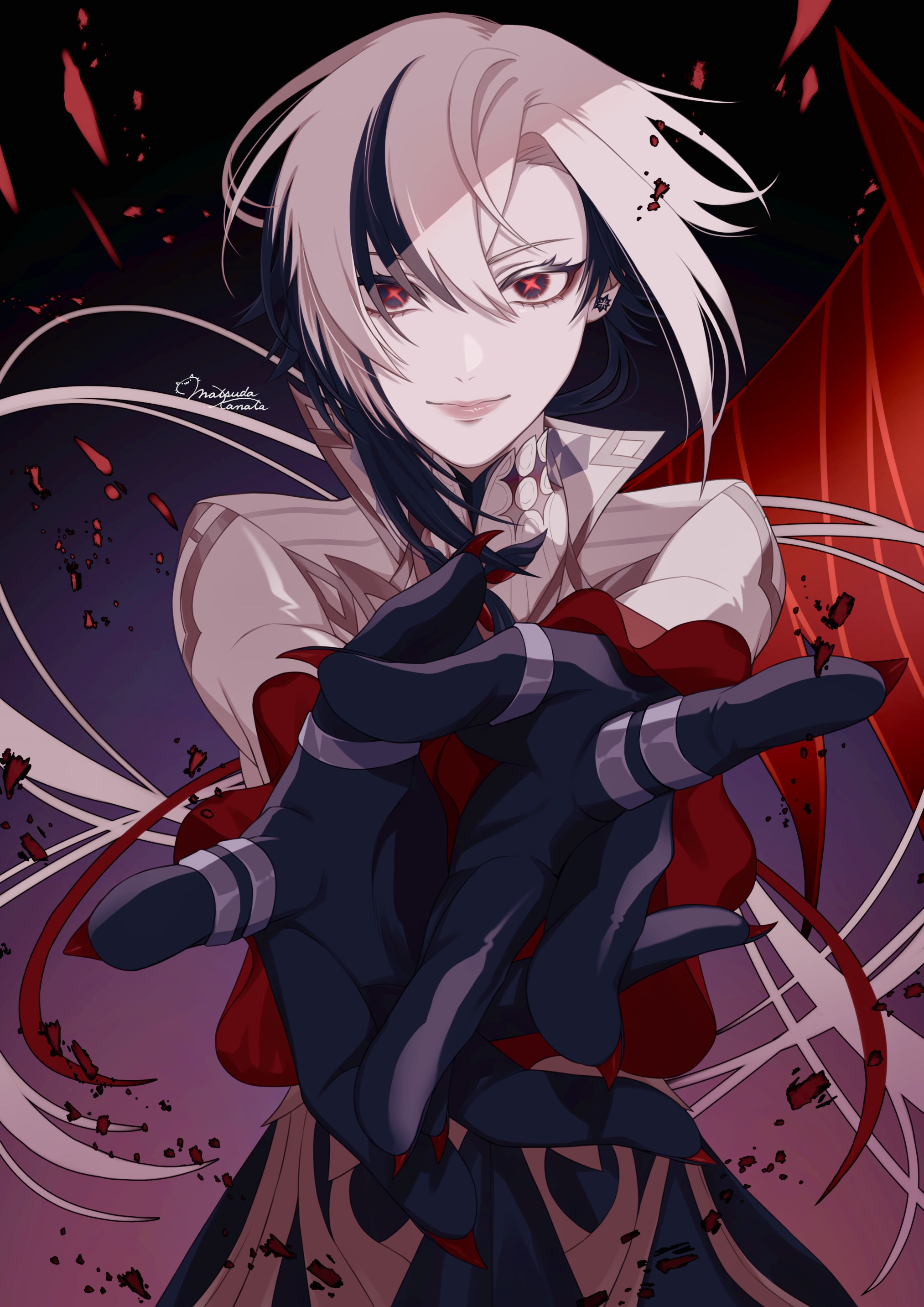 1girl absurdres arlecchino_(genshin_impact) black_eyes black_hands coat colored_extremities colored_eyelashes foreshortening genshin_impact gradient_background highres jewelry lips matsudakanata multicolored_hair multiple_rings own_hands_together pale_skin red_pupils ring signature single_wing smile solo streaked_hair symbol-shaped_pupils uneven_bangs upper_body white_coat wings x-shaped_pupils