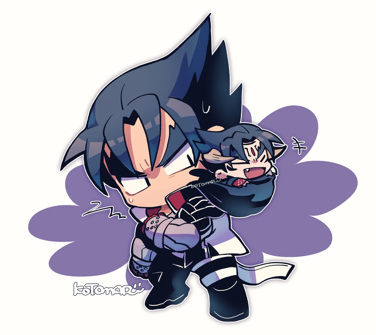 2boys black_hair black_jacket black_pants chibi chibi_only devil_jin fang forehead_jewel full_body grey_horns horns jacket kazama_jin kotomaru_(kotokoto_kottan) male_focus mini_person miniboy multiple_boys no_nose open_mouth pants signature size_difference standing studded_gloves tekken thick_eyebrows v-shaped_eyebrows white_background