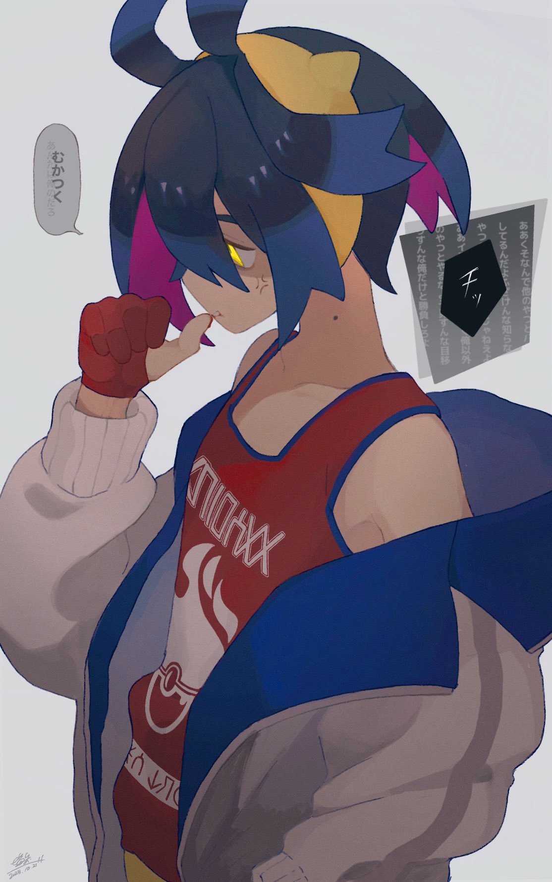 1boy 217_shion_407 anger_vein biting_own_finger black_hair dated from_side gloves grey_background hair_between_eyes hairband highres jacket kieran_(pokemon) male_focus mole mole_on_neck multicolored_hair nintendo off_shoulder open_clothes open_jacket partially_fingerless_gloves pokemon pokemon_scarlet_and_violet profile purple_hair red_gloves red_tank_top shaded_face signature simple_background solo speech_bubble tank_top translation_request white_jacket yellow_eyes yellow_hairband