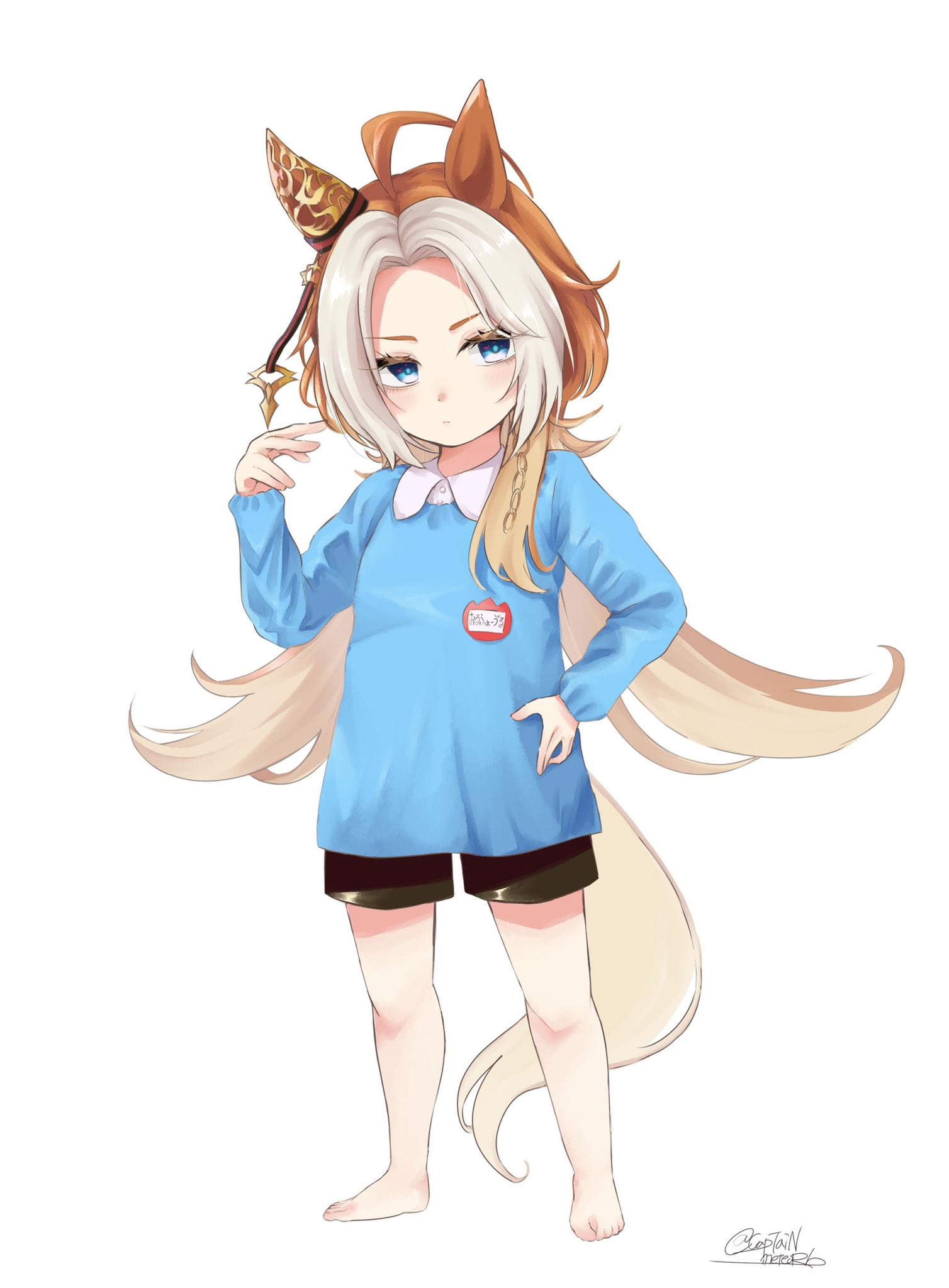 1girl aged_down ahoge animal_ears barefoot blue_eyes blue_shirt child closed_mouth collared_shirt ear_covers ear_ornament full_body hair_intakes highres horse_ears horse_girl horse_tail kindergarten_uniform long_hair long_sleeves mengo_(captainmeteor6) multicolored_hair orange_hair orfevre_(umamusume) shirt short_shorts shorts simple_background single_ear_cover solo standing tail umamusume white_background white_hair