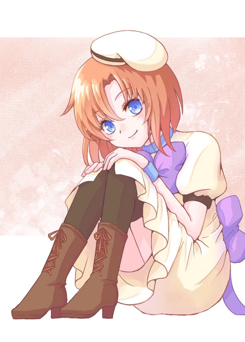 1girl blue_eyes blue_hair boots brown_boots dress hat higurashi_no_naku_koro_ni medium_hair neen ryuuguu_rena simple_background solo white_background white_dress white_hat