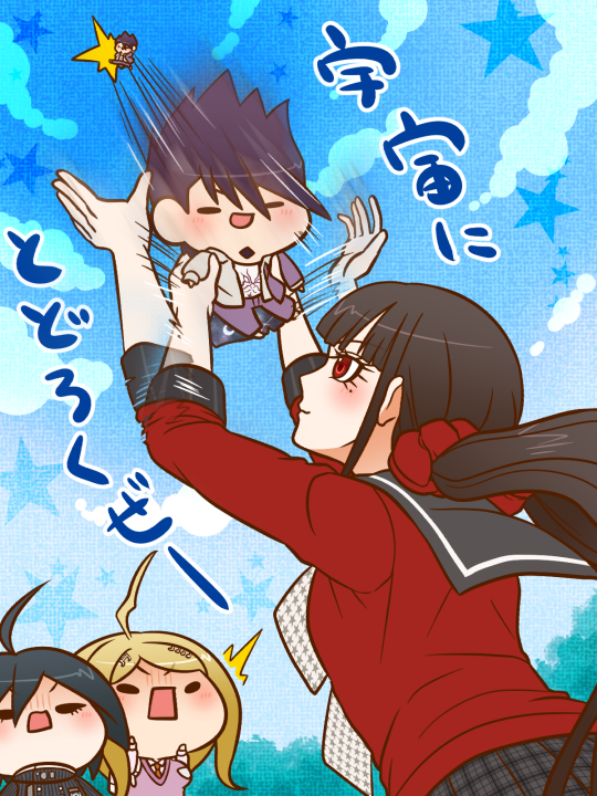 2boys 2girls ^^^ ahoge akamatsu_kaede black_eyes black_jacket black_sailor_collar black_skirt black_sleeves blonde_hair blue_hair blue_sky blunt_bangs bow bowtie breasts brown_hair buttons catching chibi closed_mouth cloud coat coat_partially_removed collared_jacket collared_shirt commentary_request cowboy_shot crescent_print crest danganronpa_(series) danganronpa_v3:_killing_harmony day double-breasted eyelashes facial_hair fortissimo goatee grey_jacket grey_sleeves hair_ornament hair_scrunchie harukawa_maki high_collar jacket layered_sleeves light_blush light_smile long_hair long_sleeves looking_at_another low_twintails medium_breasts mole mole_under_eye momota_kaito multiple_boys multiple_girls musical_note musical_note_hair_ornament necktie no_shoes open_mouth orange_necktie outdoors pants pink_vest pinstripe_jacket pinstripe_pattern plaid_clothes plaid_skirt pocket purple_coat purple_hair purple_pants purple_sleeves red_eyes red_scrunchie red_shirt saihara_shuichi sailor_collar school_uniform scrunchie serafuku shirt short_hair skirt sky smile solid_oval_eyes spiked_hair star_(symbol) star_print star_symbol_background translation_request tree twintails two-sided_coat two-sided_fabric unmoving_pattern v-neck v-shaped_eyebrows very_long_hair vest white_bow white_bowtie white_shirt white_sleeves yumaru_(marumarumaru)