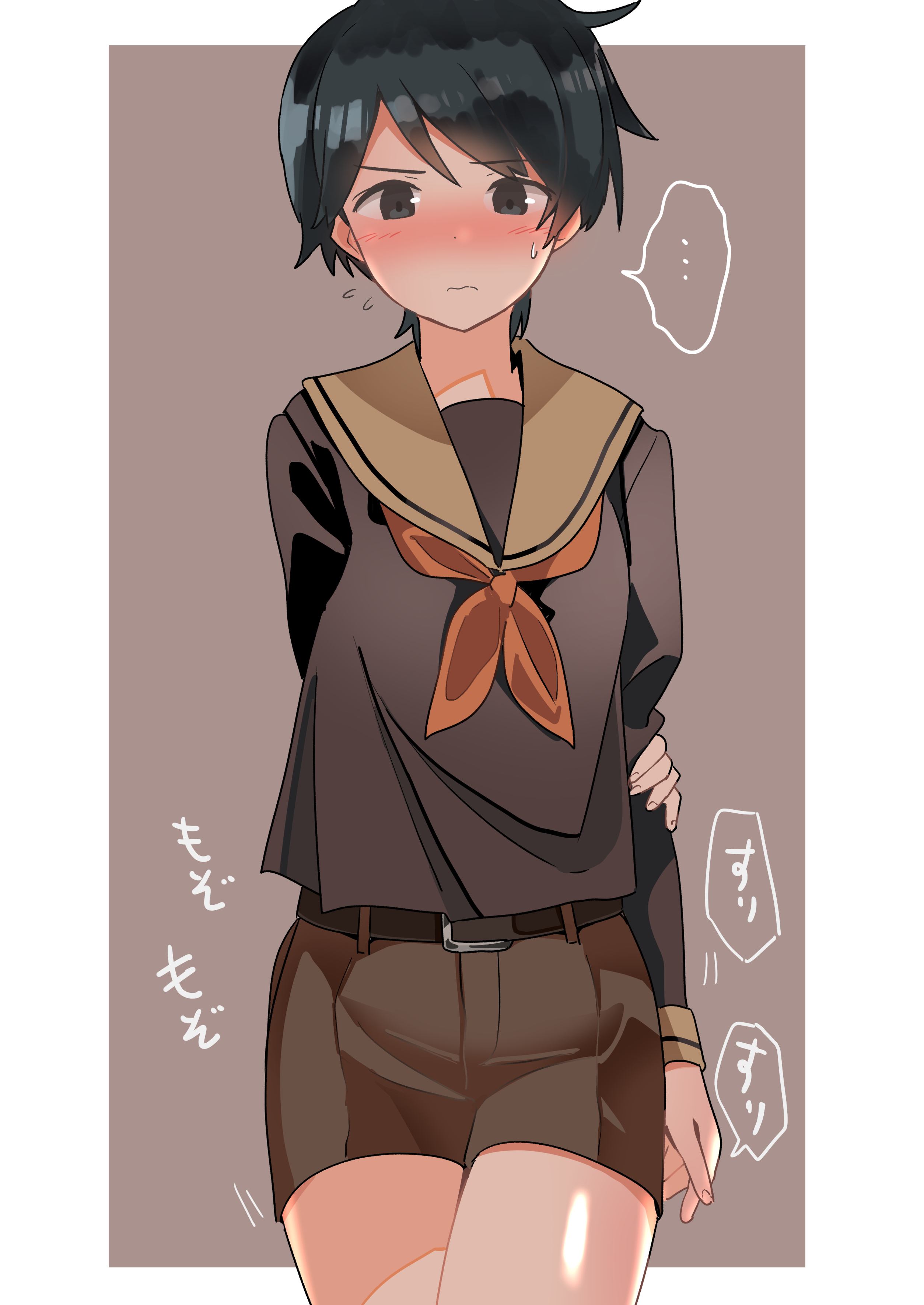 ... 1girl absurdres arms_behind_back black_hair brown_eyes brown_sailor_collar brown_serafuku brown_shirt brown_shorts cowboy_shot haida_katsuretsu highres kantai_collection mogami_(kancolle) mogami_kai_ni_(kancolle) neckerchief orange_neckerchief sailor_collar sailor_shirt school_uniform serafuku shirt short_hair shorts solo spoken_ellipsis translation_request two-tone_background