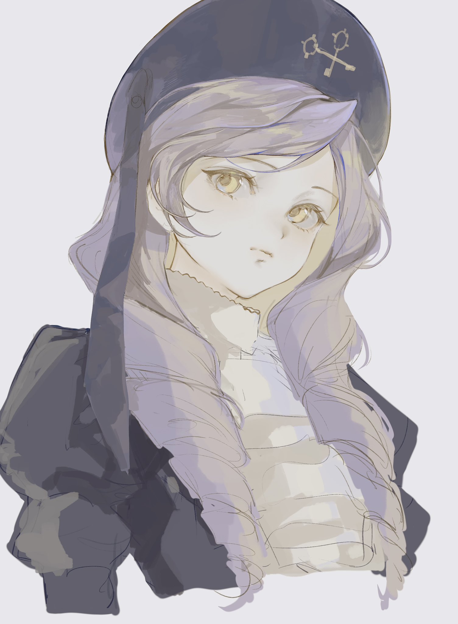 1girl ascot blue_hat blue_jacket closed_mouth dlanor_a._knox drill_hair expressionless giraffe_three grey_background grey_hair hat highres jacket long_hair looking_at_viewer parted_bangs simple_background solo umineko_no_naku_koro_ni upper_body white_ascot yellow_eyes