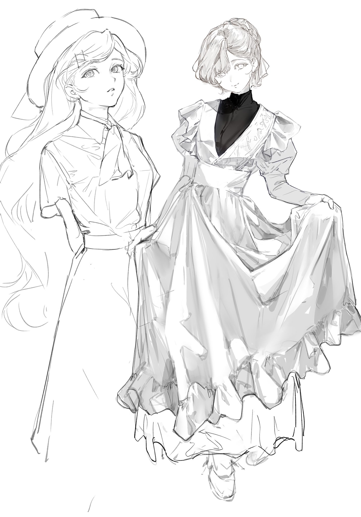 1girl closed_mouth dress giraffe_three greyscale hair_bun hat highres long_hair long_sleeves looking_at_viewer monochrome multiple_views original parted_bangs simple_background sketch smile standing unfinished white_background