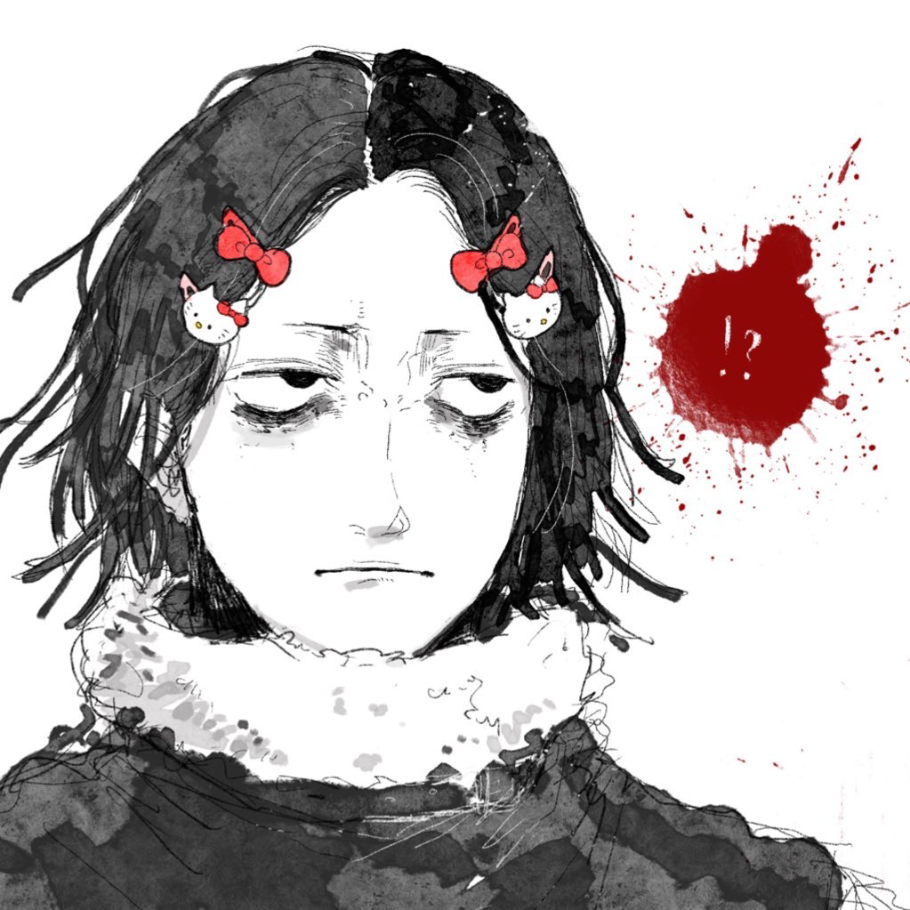 !? 1boy bags_under_eyes black_eyes blood character_hair_ornament fur_trim hair_ornament hairclip haruho_drst hello_kitty kagurabachi male_focus medium_hair messy_hair monochrome sanrio sketch solo soujou_genichi upper_body