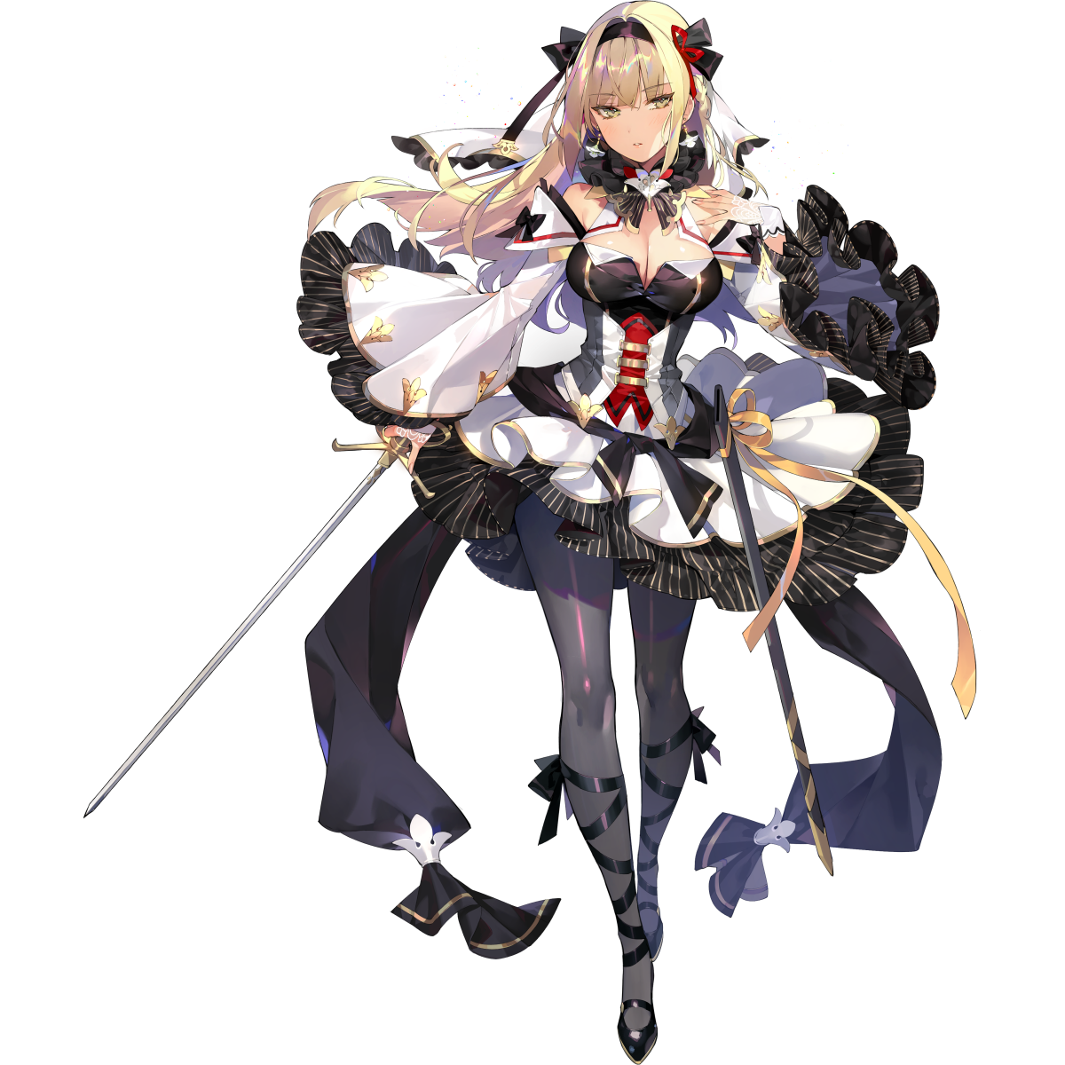 1girl artist_request black_bow black_collar black_hairband black_ribbon black_shoes black_skirt black_sleeves black_thighhighs blonde_hair bow breasts cleavage collar corset detached_collar detached_sleeves earrings final_gear full_body grey_corset hair_intakes hair_ribbon hairband highres horizontal_striped_skirt jewelry lace-up_legwear large_breasts layered_skirt layered_sleeves looking_to_the_side mary_janes narrowed_eyes official_art open_mouth pinstripe_pattern pinstripe_skirt pinstripe_sleeves rapier red_ribbon ribbon shoes simple_background skirt sleeve_bow solo striped_clothes striped_skirt sword tachi-e taysia_graft_(final_gear) teeth thighhighs third-party_source transparent_background two-tone_corset two-tone_skirt two-tone_sleeves vertical-striped_clothes vertical-striped_ribbon vertical-striped_skirt vertical-striped_sleeves walking weapon white_skirt white_sleeves yellow_eyes yellow_ribbon