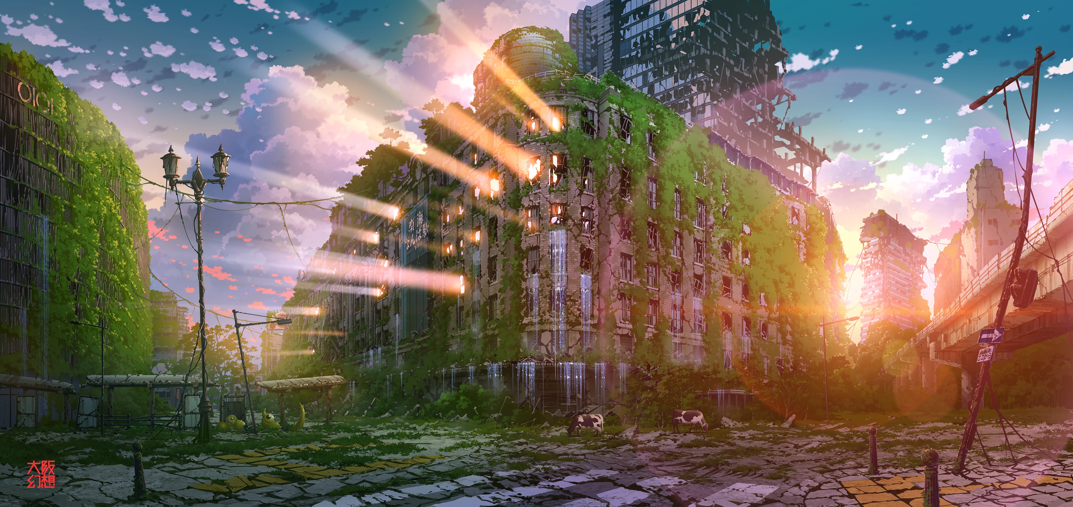 abandoned absurdres animal arrow_(symbol) blue_sky broken_window building cloud commentary_request cow crack dilapidated glowing highres lamppost moss no_humans original outdoors overgrown plant post-apocalypse power_lines ruins scenery sign sky sunrise tentacles tokyogenso vines water waterfall