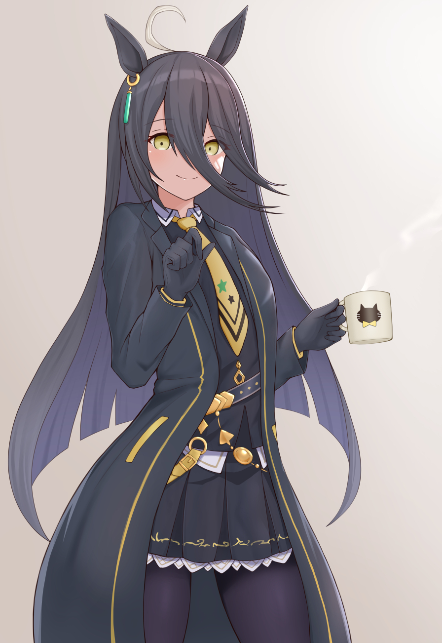 1girl animal_ears black_coat black_gloves black_hair black_pantyhose black_shirt black_skirt closed_mouth coat coffee_mug commission cup earrings gloves hair_between_eyes highres holding holding_cup horse_ears horse_girl jewelry looking_at_viewer manhattan_cafe_(creeping_shadow)_(umamusume) manhattan_cafe_(umamusume) mug necktie pantyhose pleated_skirt shirt single_earring skeb_commission skirt smile solo star_(symbol) star_print umamusume yellow_eyes yellow_necktie yousui