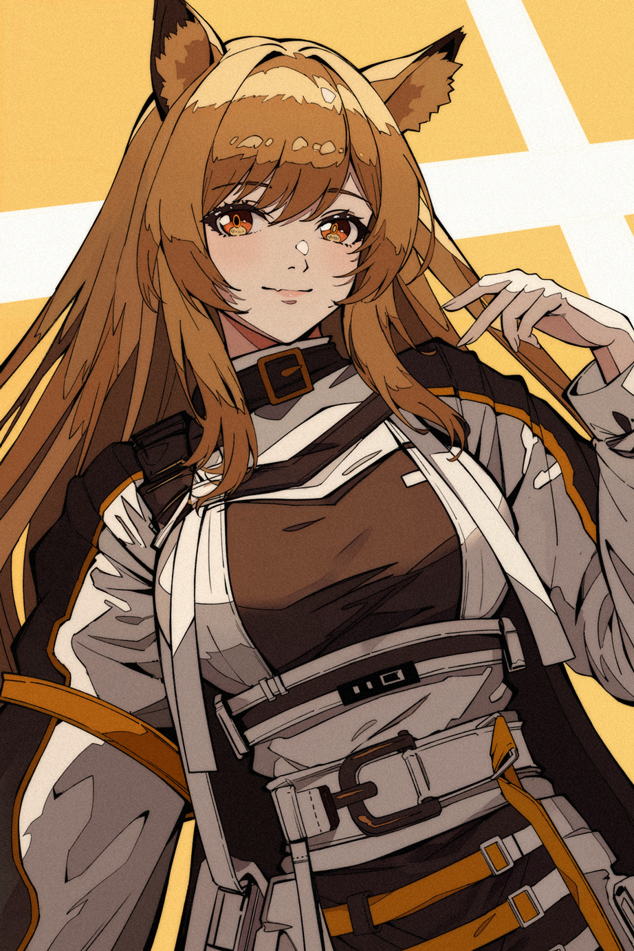 1girl animal_ears arknights belt_buckle belt_collar blush brown_hair buckle ceobe_(arknights) chinese_commentary collar commentary dog_ears dog_girl fang film_grain hair_intakes hand_up heavy_film_grain highres jacket light_smile long_hair looking_at_viewer orange_eyes puffy_sleeves skin_fang solo upper_body wanlai_bu_shiman white_jacket yellow_background