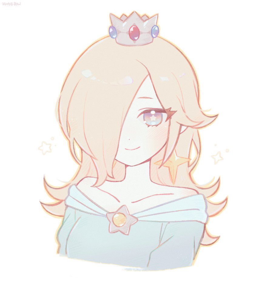 1girl bare_shoulders blonde_hair blue_dress blue_eyes brooch closed_mouth cropped_torso crown dress earrings hair_over_one_eye jewelry long_hair looking_at_viewer mario_(series) nintendo off-shoulder_dress off_shoulder oxo_xwo rosalina smile solo star-shaped_pupils star_(symbol) star_brooch star_earrings super_mario_galaxy symbol-shaped_pupils upper_body white_background