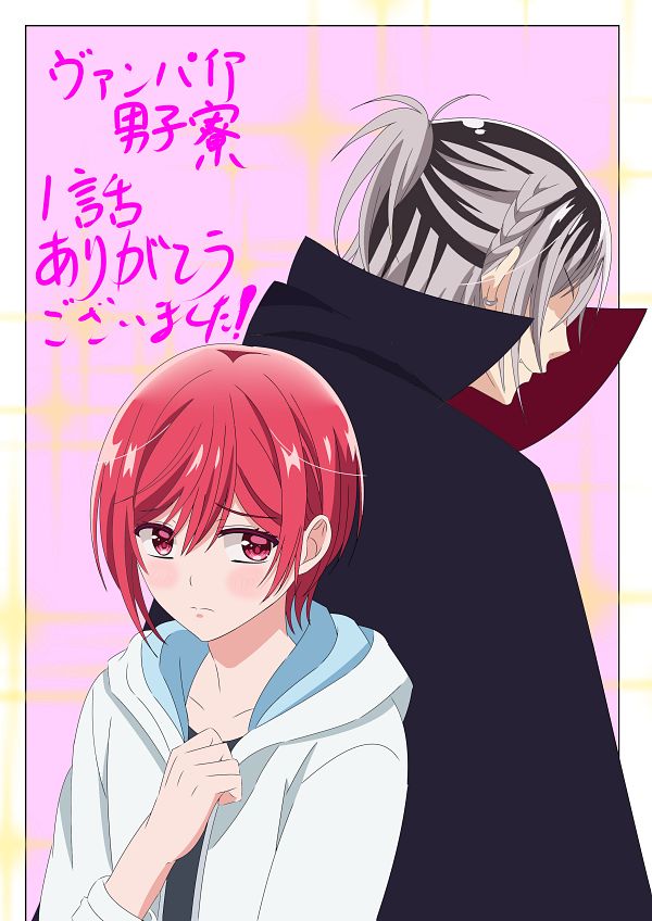 1boy 1girl black_cape black_hair black_shinkalion_berserker_mode blush cape closed_mouth grey_hair hand_up japanese_text long_hair looking_at_another looking_back multicolored_hair official_art pink_background pink_eyes red_eyes red_hair saotome_ruka sweater two-tone_hair vampire_dormitory very_long_hair white_sweater yamamoto_mito