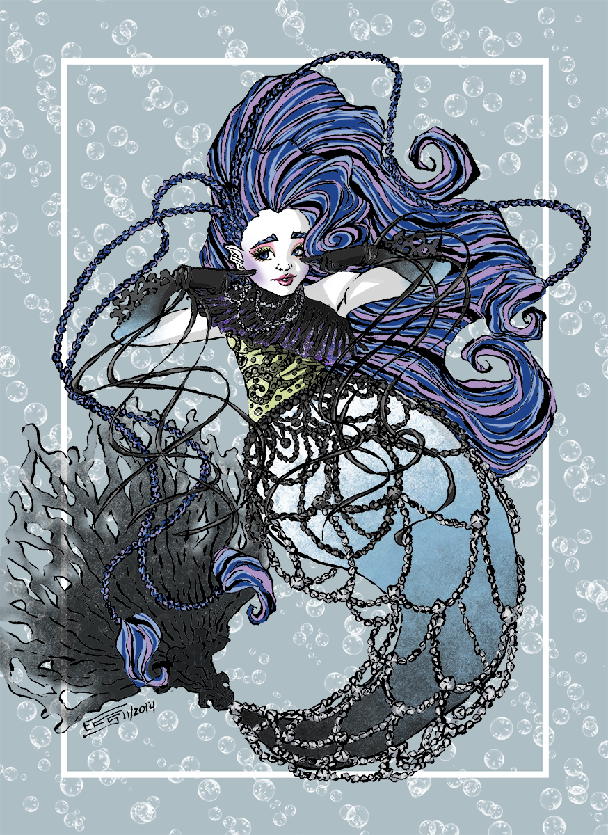 1girl chain elisafs fins fish_tail floating_hair highres ink long_hair looking_at_viewer mermaid monster_girl monster_high monster_high_(g1) pale_skin photoshop_(medium) purple_hair sirena_von_boo solo tail third-party_edit very_long_hair