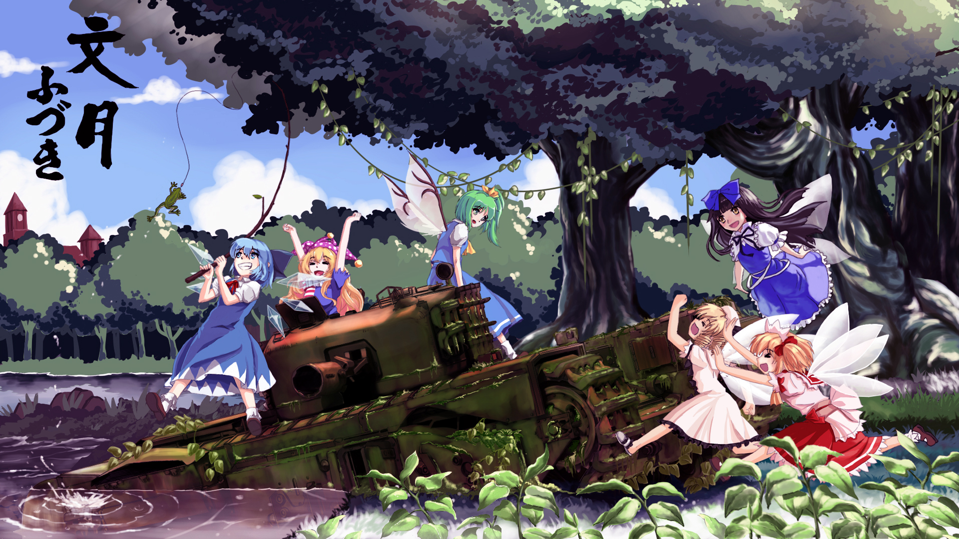 6+girls american_flag_dress black_hair blonde_hair blue_eyes blue_hair bow brown_eyes brown_hair churchill_(tank) cirno clownpiece daiyousei day dress drill_hair fairy fairy_wings fishing fishing_rod frog frolicking_fairies_of_gensokyo_(touhou) green_eyes green_hair hair_bow hair_ribbon hat highres holding holding_fishing_rod ice ice_wings jester_cap lake long_hair luna_child military_vehicle motor_vehicle multiple_girls nature open_mouth orange_hair outdoors puffy_sleeves ribbon short_hair short_sleeves side_ponytail smile star_sapphire sunny_milk tank touhou tree vittorio_veneto_(fayuuka) wings