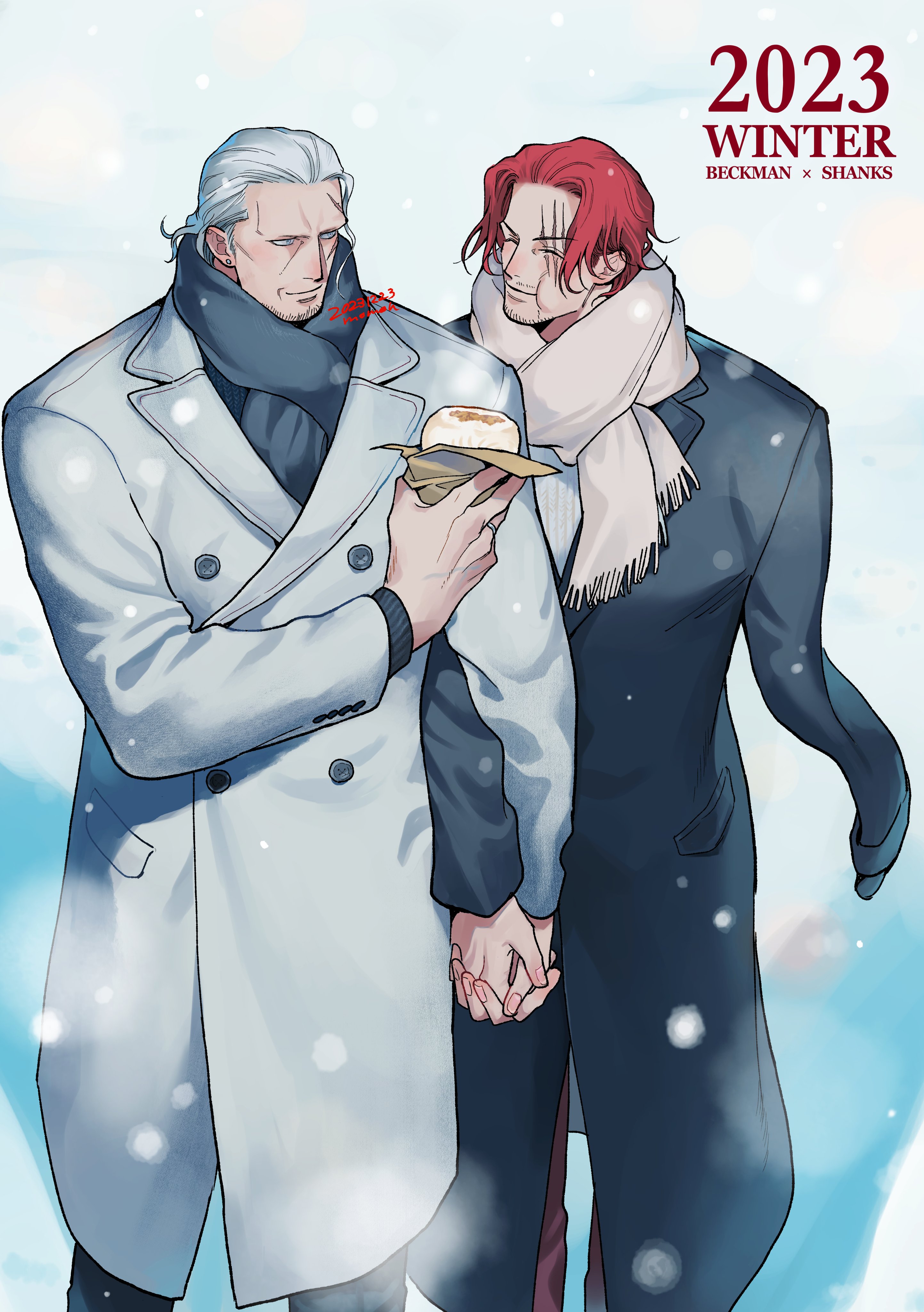 2boys absurdres alternate_costume beard_stubble benn_beckman black_coat black_pants black_scarf character_name closed_eyes coat dated english_text facial_hair food grey_eyes hair_slicked_back highres holding holding_food holding_hands long_coat looking_at_another male_focus momoh_jiyucho multiple_boys one_piece outdoors pants red_hair red_pants scarf shanks_(one_piece) short_hair snowing stubble white_coat white_hair white_scarf