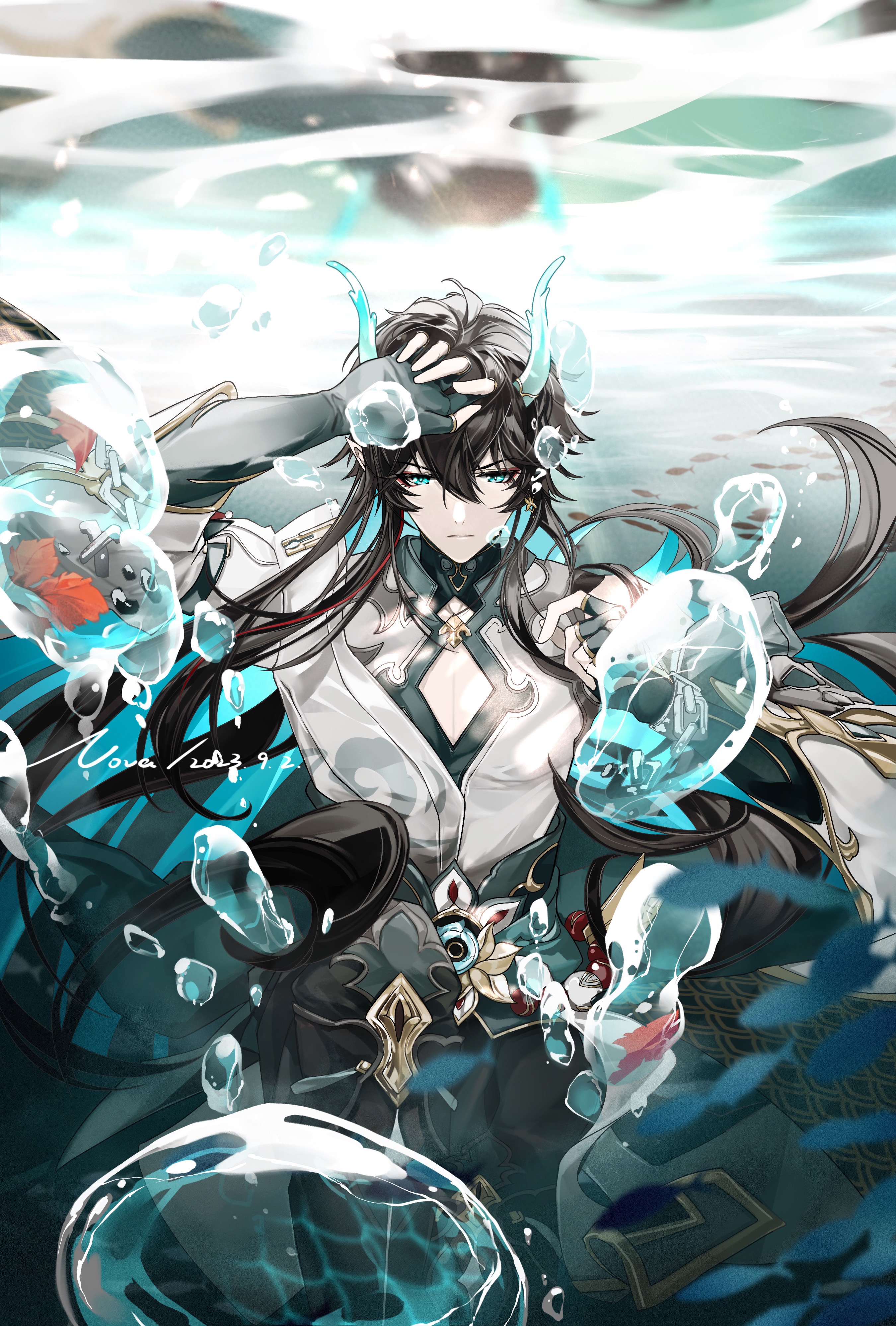 1boy absurdres air_bubble arm_up autumn_leaves black_hair black_pants blue_eyes broken broken_chain bubble chain chinese_commentary cloud_print commentary cowboy_shot dan_heng_(honkai:_star_rail) dated dragon_horns earrings eastern_dragon_horns elbow_gloves eyeliner fingerless_gloves gloves gold_earrings highres honkai:_star_rail honkai_(series) horns jewelry knee_up leaf long_hair looking_at_viewer makeup male_focus nnnnnova pants pointy_ears print_shirt procreate_(medium) red_eyeliner sash scale_print shirt signature single_earring solo straight-on submerged underwater white_shirt
