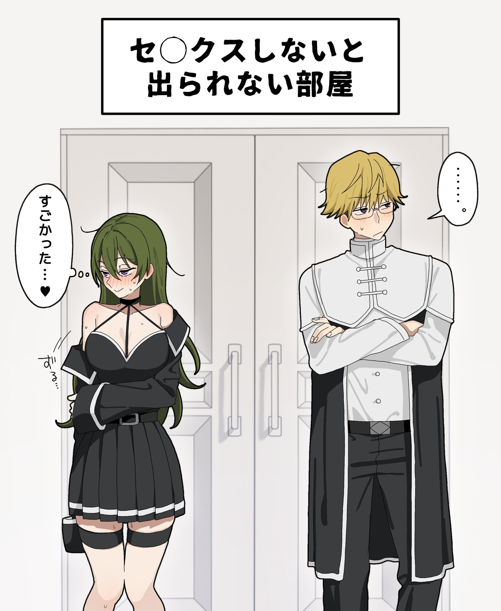 ... 1boy 1girl black_choker black_dress black_jacket black_pants blonde_hair blush choker commentary_request cowboy_shot crossed_arms dress glasses green_hair highres jacket kayuu_(hikentai0112) land_(sousou_no_frieren) long_hair long_sleeves pants pleated_dress purple_eyes room_you_can't_get_out_of_unless_you_x_(meme) shirt short_hair smile sousou_no_frieren speech_bubble spoken_ellipsis standing thigh_strap thought_bubble translated ubel_(sousou_no_frieren) white_shirt