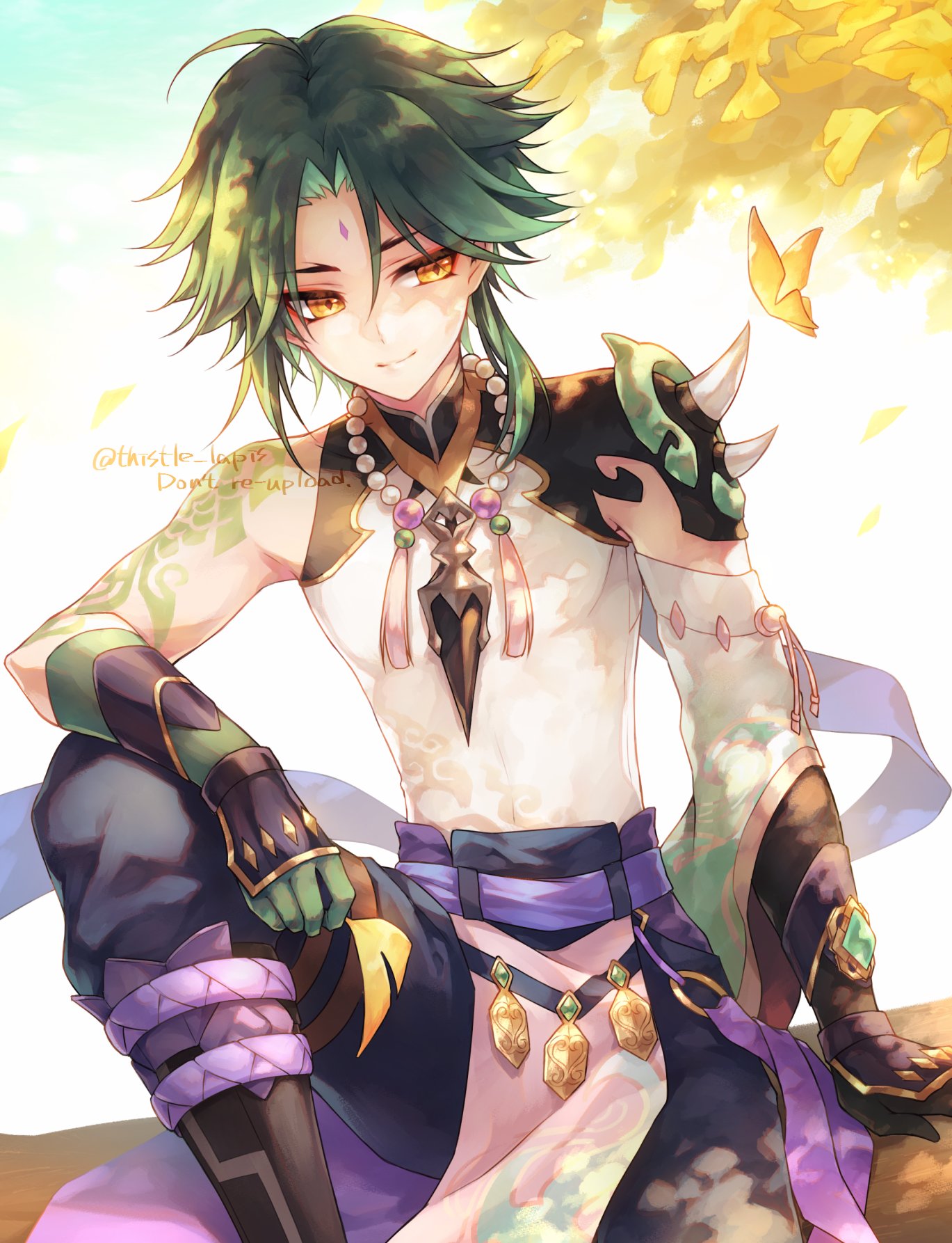 1boy ahoge arm_tattoo armor artist_name asymmetrical_gloves baggy_pants belt black_gloves blue_hair blue_pants blue_sky boots branch brown_boots bug butterfly butterfly_wings closed_mouth crystal day detached_sleeves diamond-shaped_pupils diamond_(shape) eyeshadow genshin_impact ginkgo_leaf gloves gold_trim green_gloves green_hair hair_between_eyes highres insect insect_wings jewelry leaf long_sleeves makeup male_focus mandarin_collar mismatched_gloves multicolored_hair necklace outdoors pants pearl_necklace pelvic_curtain purple_belt red_eyeshadow shirt short_hair shoulder_armor sidelocks single_bare_shoulder single_detached_sleeve sitting sky sleeveless sleeveless_shirt smile solo symbol-shaped_pupils tassel tattoo thistle_lapis tree two-tone_hair white_shirt wide_sleeves wings xiao_(genshin_impact) yellow_butterfly yellow_eyes