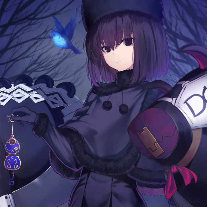 1girl black_eyes black_gloves black_hair bob_cut capelet familiar fur-trimmed_capelet fur_hat fur_trim gloves hat kuonji_alice lost_robin_rondo mahou_tsukai_no_yoru neko_daruma ushanka