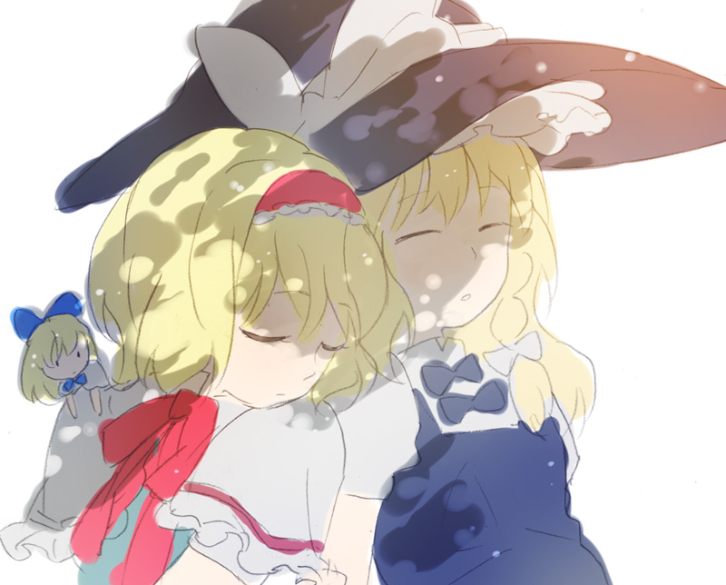 3girls alice_margatroid black_bow black_bowtie black_hat blonde_hair blue_bow bow bowtie braid capelet closed_eyes closed_mouth dappled_sunlight doll frilled_capelet frilled_hairband frills hair_bow hairband hat hat_bow head_on_another's_shoulder kazune_(baumkuchen) kirisame_marisa leaning_on_person light_particles lolita_hairband long_hair multiple_girls neck_ribbon parted_lips red_hairband red_ribbon ribbon shanghai_doll short_hair short_sleeves side_braid simple_background sleeping sleeping_upright sunlight third-party_source touhou u_u upper_body white_background white_bow white_capelet witch_hat