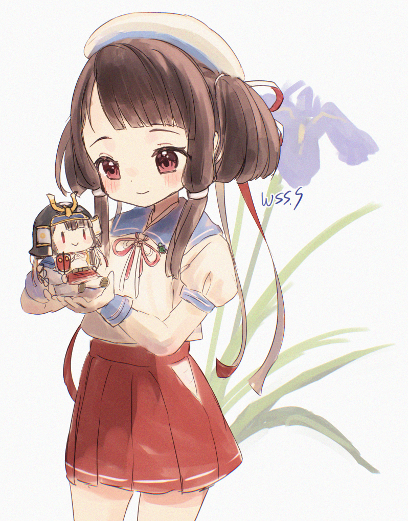 2girls apron black_hair blue_sailor_collar brown_apron child clothing_cutout cowboy_shot fairy_(kancolle) flower flower_request gloves hat hip_vent kantai_collection kurahashi_(kancolle) low-tied_sidelocks medium_hair mini_person minigirl multiple_girls pleated_skirt puffy_short_sleeves puffy_sleeves red_eyes red_skirt sailor_collar sailor_hat sailor_shirt shirt short_sleeves sidelocks simple_background skirt smile twintails white_background white_gloves white_shirt wss_(nicoseiga19993411)