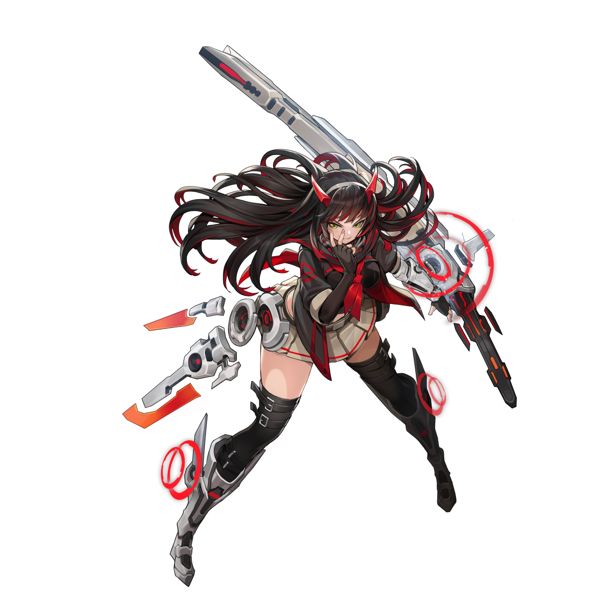 1girl artist_request belt black_belt black_gloves black_hair black_jacket black_shirt black_sleeves black_thighhighs brown_skirt choppy_bangs elbow_gloves fake_horns fighting_stance final_gear fingerless_gloves full_body gloves grin hairband headphones highres horizontal-striped_skirt horns jacket leg_belt legs_apart long_hair looking_to_the_side mecha_musume mechanical_arms mechanical_legs midriff multicolored_hair multicolored_jacket neckerchief official_art open_clothes open_jacket open_mouth pleated_skirt pn72_yogui red_hair red_neckerchief shirt simple_background single_mechanical_arm skirt sleeves_rolled_up smile solo standing striped_clothes striped_jacket striped_skirt tachi-e teeth thighhighs third-party_source three-quarter_sleeves transparent_background triangle_print two-tone_hair two-tone_jacket two-tone_skirt two-tone_sleeves vertical-striped_clothes vertical-striped_jacket very_long_hair weapon white_hairband yellow_eyes