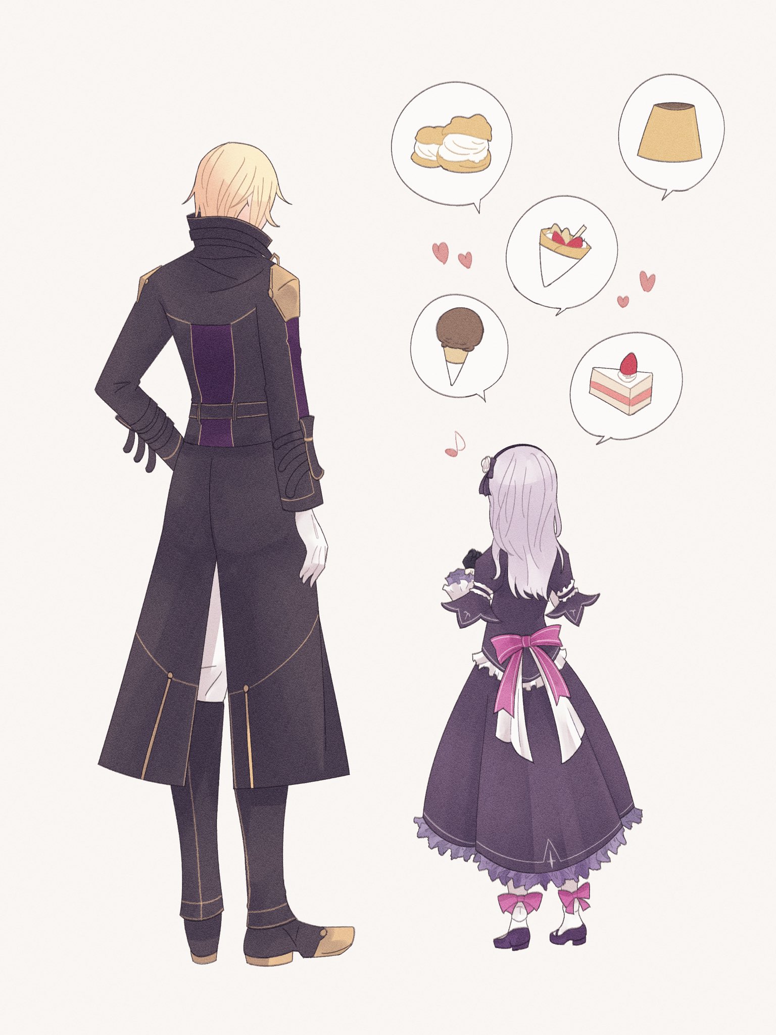1boy 1girl back_bow black_coat black_footwear blonde_hair boots bow c_(eiyuu_densetsu) cake chocolate coat commentary_request dress eiyuu_densetsu fiorire_fiore food from_behind gloves hajimari_no_kiseki heart highres ice_cream knee_boots lapis_rosenberg lolita_fashion musical_note pink_bow pudding purple_dress purple_hair rufus_albarea scone simple_background speech_bubble spoilers spoken_food strawberry_shortcake thought_bubble white_background white_gloves