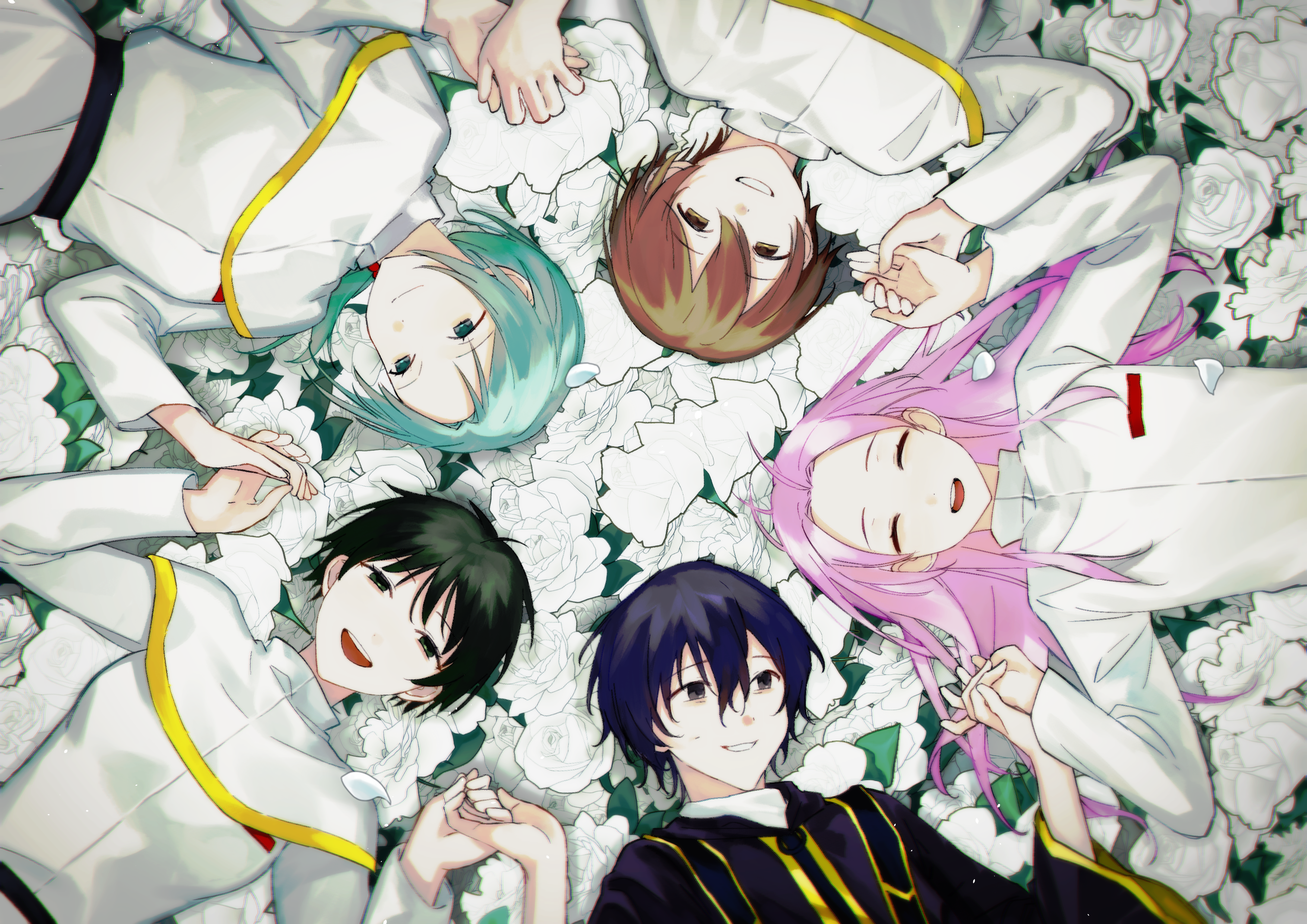 2girls 3boys absurdres aqua_eyes aqua_hair belt black_belt blue_hair brown_eyes brown_hair capelet chinese_commentary closed_eyes closed_mouth commentary commentary_request dark_blue_hair english_commentary enomoto_noa flower gold_trim green_eyes green_hair grey_eyes grin group_picture hair_between_eyes hatsutori_hajime highres holding_hands isoi_rai jabuchi_you kyoko_(akakikyoko) light_particles long_hair lying mixed-language_commentary multiple_boys multiple_girls on_back pink_hair rose saibou_shinkyoku shirt short_hair smile stole teeth upper_teeth_only utsugi_noriyuki white_capelet white_flower white_rose white_shirt