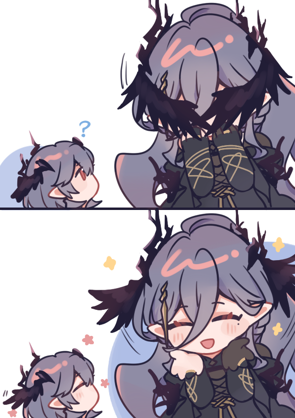 1boy 1girl arknights black_dress blush child dress grey_hair kunogawa laqeramaline_(arknights) logos_(arknights) long_hair looking_at_another mother_and_child mother_and_son parent_and_child pointy_ears
