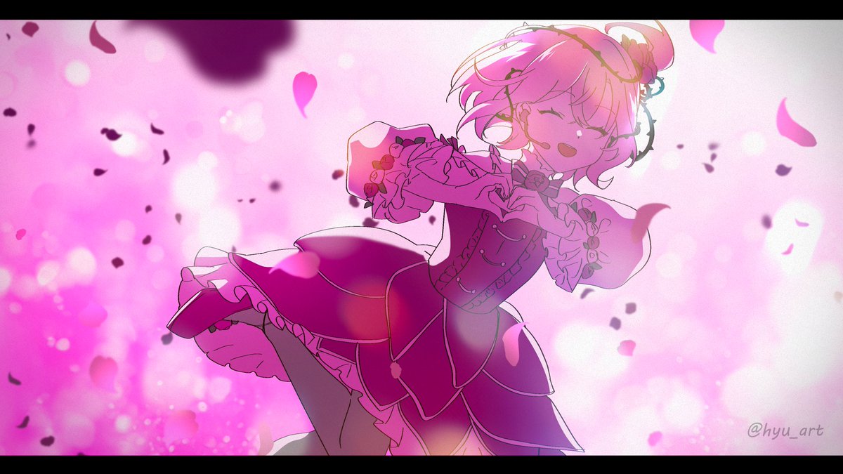 1girl closed_eyes dress flower hair_flower hair_ornament heart heart_hands hyu_art nijisanji nijisanji_en open_mouth petals pink_hair plant red_dress red_flower red_rose rose rosemi_lovelock rosemi_lovelock_(1st_costume) side_ponytail solo thorns twitter_username vines virtual_youtuber white_flower white_rose