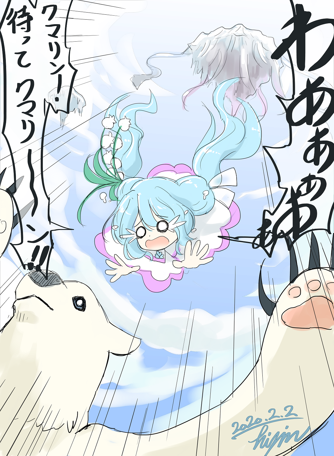 1girl bear blue_hair blue_sky cloud cloudy_sky crying crying_with_eyes_open dated dress emphasis_lines falling full_body highres hisin long_hair looking_at_viewer o_o open_mouth polar_bear signature sky solo tears ursula_(xenoblade) white_dress xenoblade_chronicles_(series) xenoblade_chronicles_2