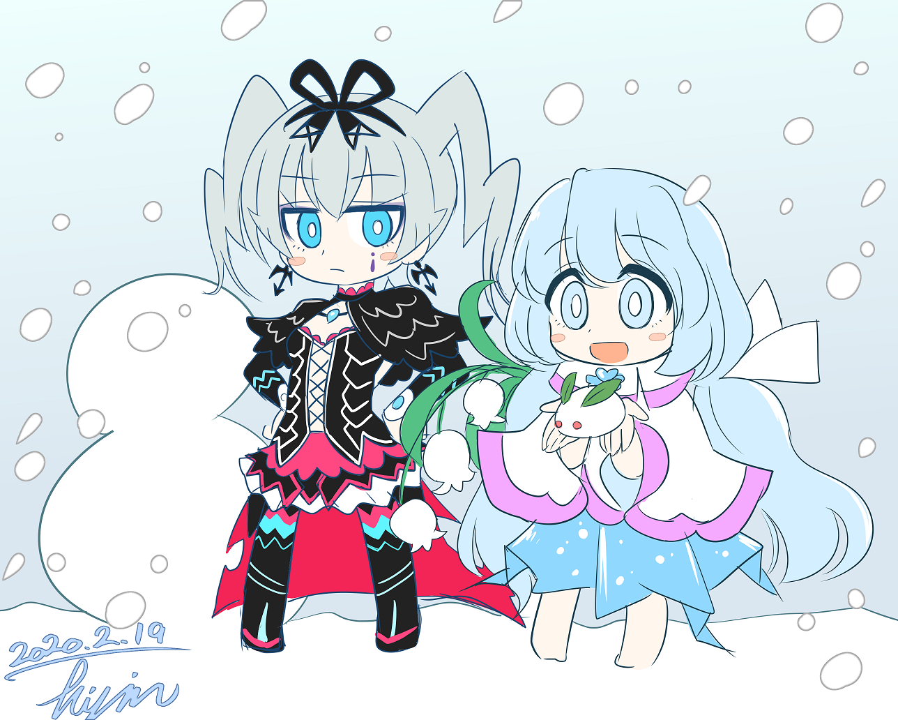 2girls :d bare_shoulders black_dress black_footwear blue_eyes blue_hair blush_stickers boots chibi closed_mouth core_crystal_(xenoblade) dated dress earrings full_body grey_hair headband hisin jewelry lolita_fashion long_hair multiple_girls open_mouth outdoors signature smile snow snowing standing tareme tattoo teardrop_tattoo thigh_boots ursula_(xenoblade) vale_(xenoblade) white_dress winter xenoblade_chronicles_(series) xenoblade_chronicles_2
