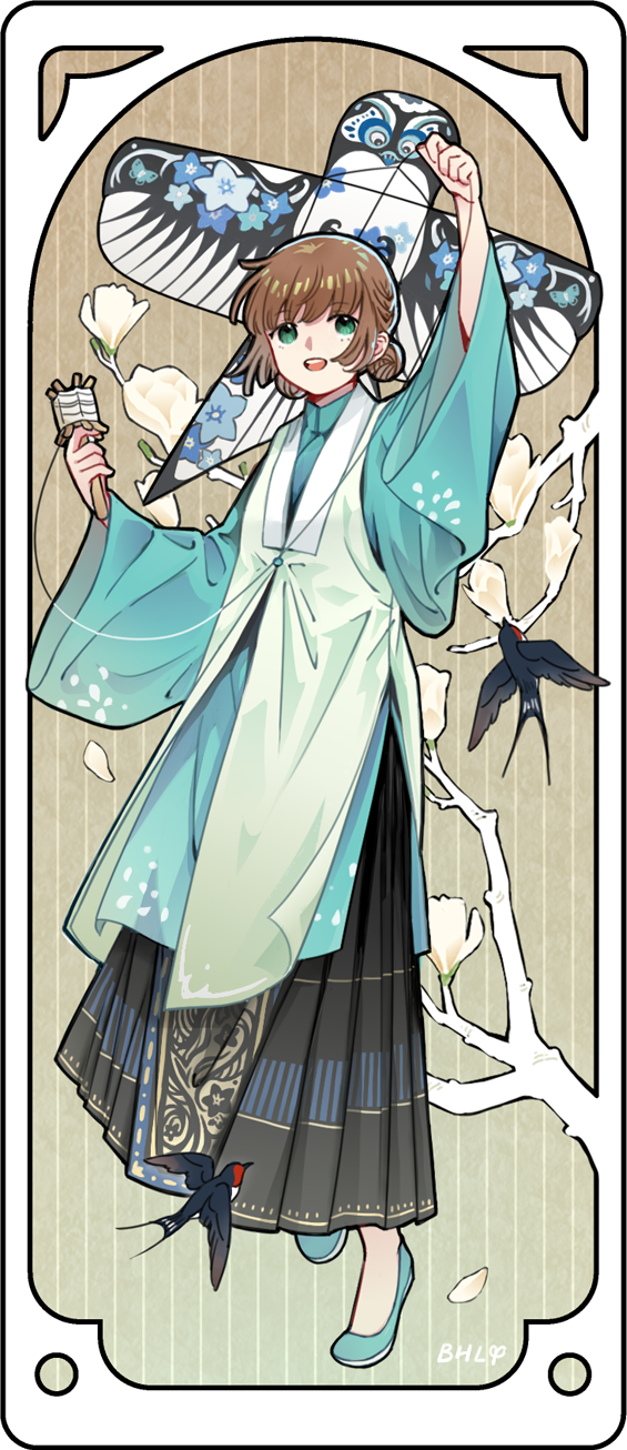 1girl aoqun aqua_hanfu arm_up bird blue_shoes bohe_liang_you brown_hair chinese_clothes duijin_ruqun flower full_body green_eyes hanfu highres holding kite long_sleeves looking_at_viewer shoes short_hair skirt smile solo standing swallow_(bird) white_flower wide_sleeves