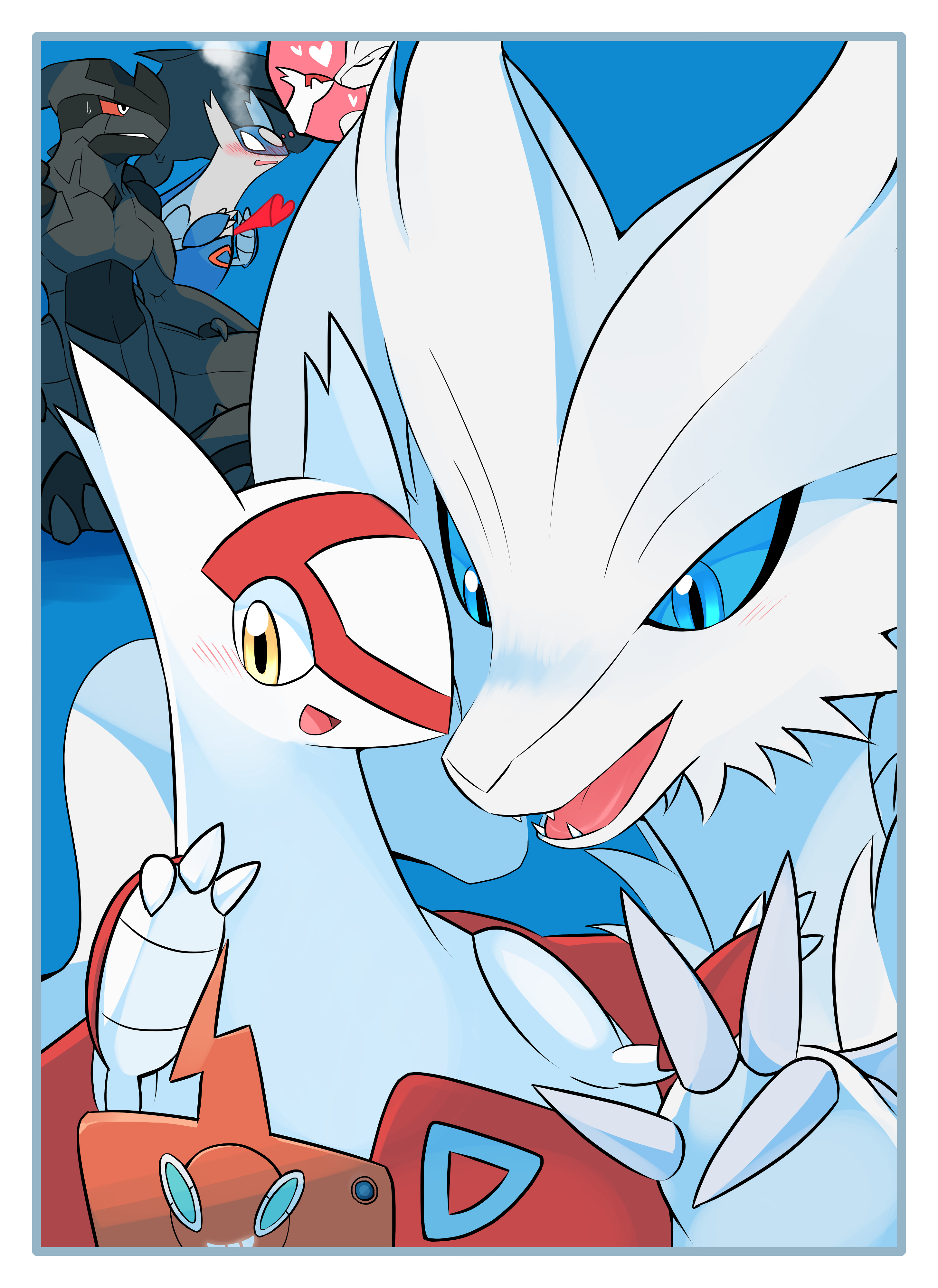 absurdres blue_eyes blue_sclera blush claws colored_sclera dragon elaphe_guttata6 fang gen_3_pokemon gen_4_pokemon gen_5_pokemon heart highres kiss latias latios legendary_pokemon long_hair nintendo no_humans open_mouth pokemon pokemon_(creature) red_sclera reshiram rotom rotom_phone smile sweat tongue v white_eyes yellow_eyes zekrom