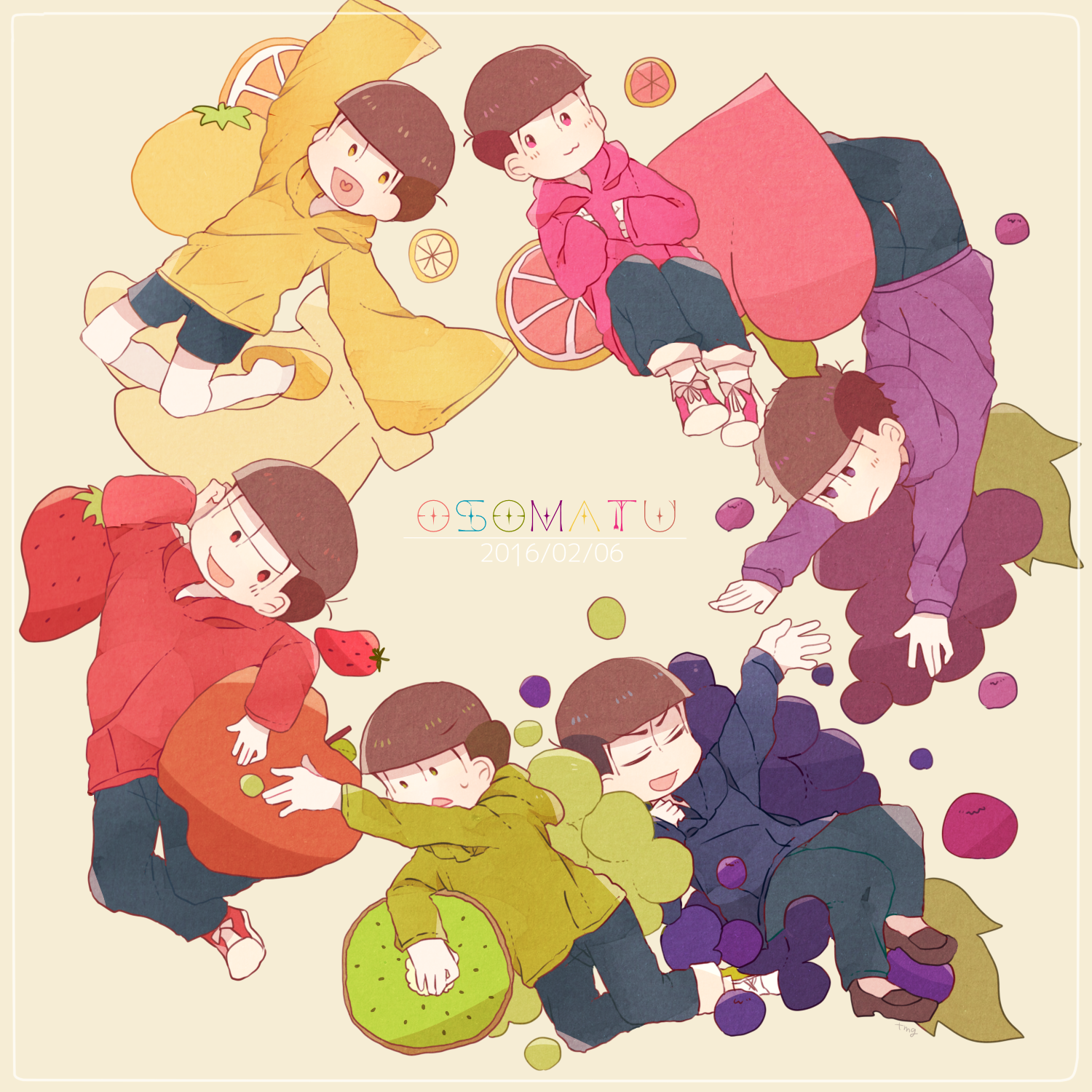 6+boys :3 apple bowl_cut brothers brown_hair closed_eyes copyright_name dated food frown fruit grapes green_eyes half-closed_eyes heart heart_in_mouth highres hood hoodie kiwi_(fruit) kiwi_slice long_sleeves looking_to_the_side male_focus matsuno_choromatsu matsuno_ichimatsu matsuno_jyushimatsu matsuno_karamatsu matsuno_osomatsu matsuno_todomatsu messy_hair multiple_boys open_mouth orange_(fruit) orange_slice osomatsu-san osomatsu_(series) pants pink_eyes ponponzutea purple_eyes red_eyes shoes short_hair shorts siblings slippers smile sneakers strawberry sweat typo yellow_eyes