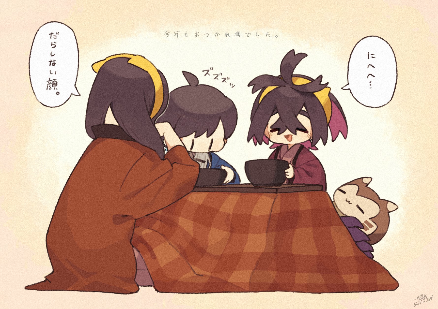 1girl 217_shion_407 2boys :3 black_hair blush bowl carmine_(pokemon) chibi closed_eyes crossed_bangs dated eating florian_(pokemon) food furret gen_2_pokemon hairband highres japanese_clothes kieran_(pokemon) kotatsu long_hair multicolored_hair multiple_boys nintendo noodles open_mouth pokemon pokemon_(creature) pokemon_scarlet_and_violet purple_hair signature simple_background sitting table translation_request