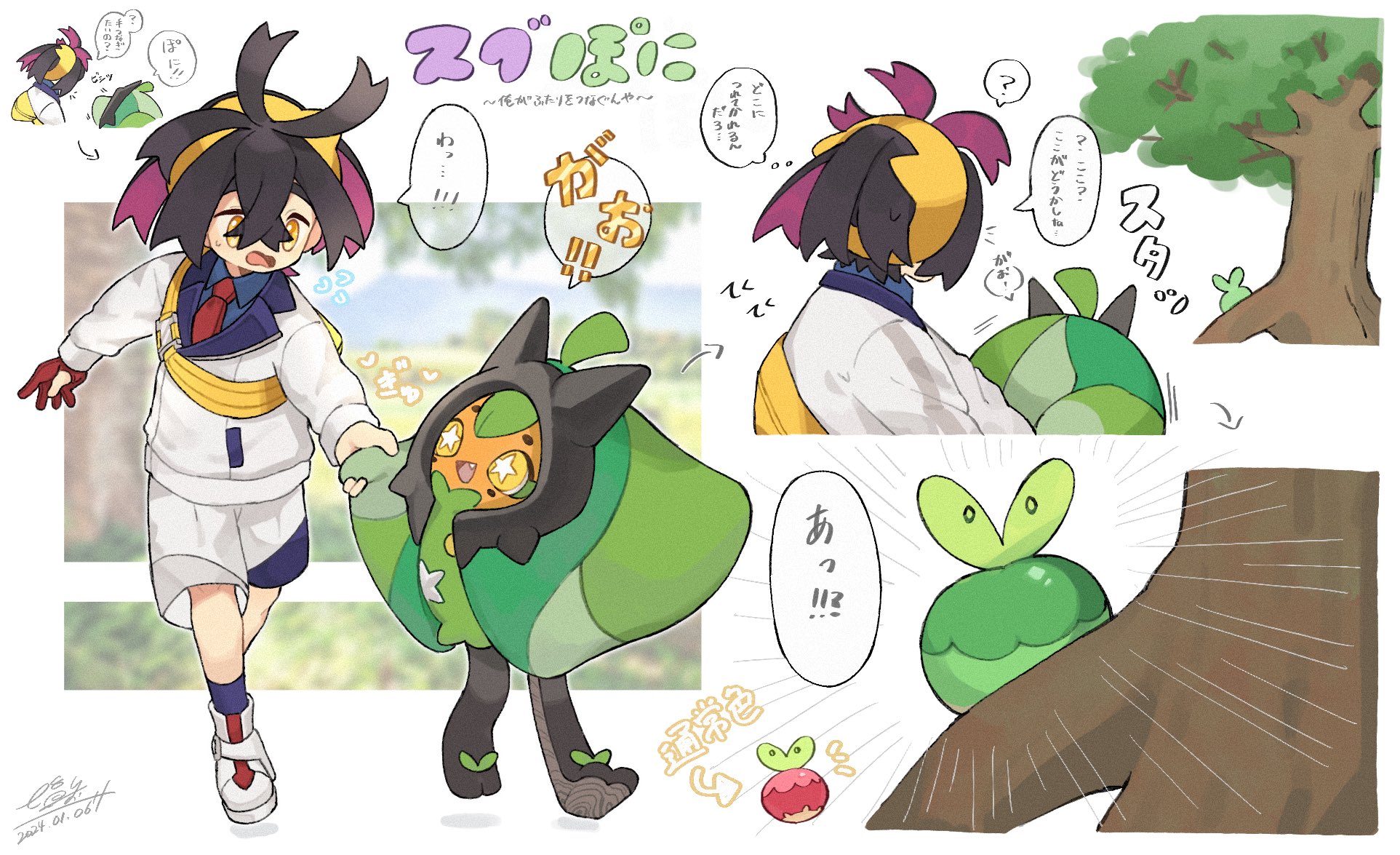 1boy 217_shion_407 alternate_color applin black_hair collared_shirt crossed_bangs dated day flying_sweatdrops gen_8_pokemon gloves hair_between_eyes hairband highres jacket kieran_(pokemon) long_sleeves male_focus multicolored_hair multiple_views necktie nintendo ogerpon open_mouth outdoors partially_fingerless_gloves pokemon pokemon_(creature) pokemon_scarlet_and_violet shiny_and_normal shiny_pokemon shirt shoes shorts signature single_glove star-shaped_pupils star_(symbol) sweat symbol-shaped_pupils translation_request tree