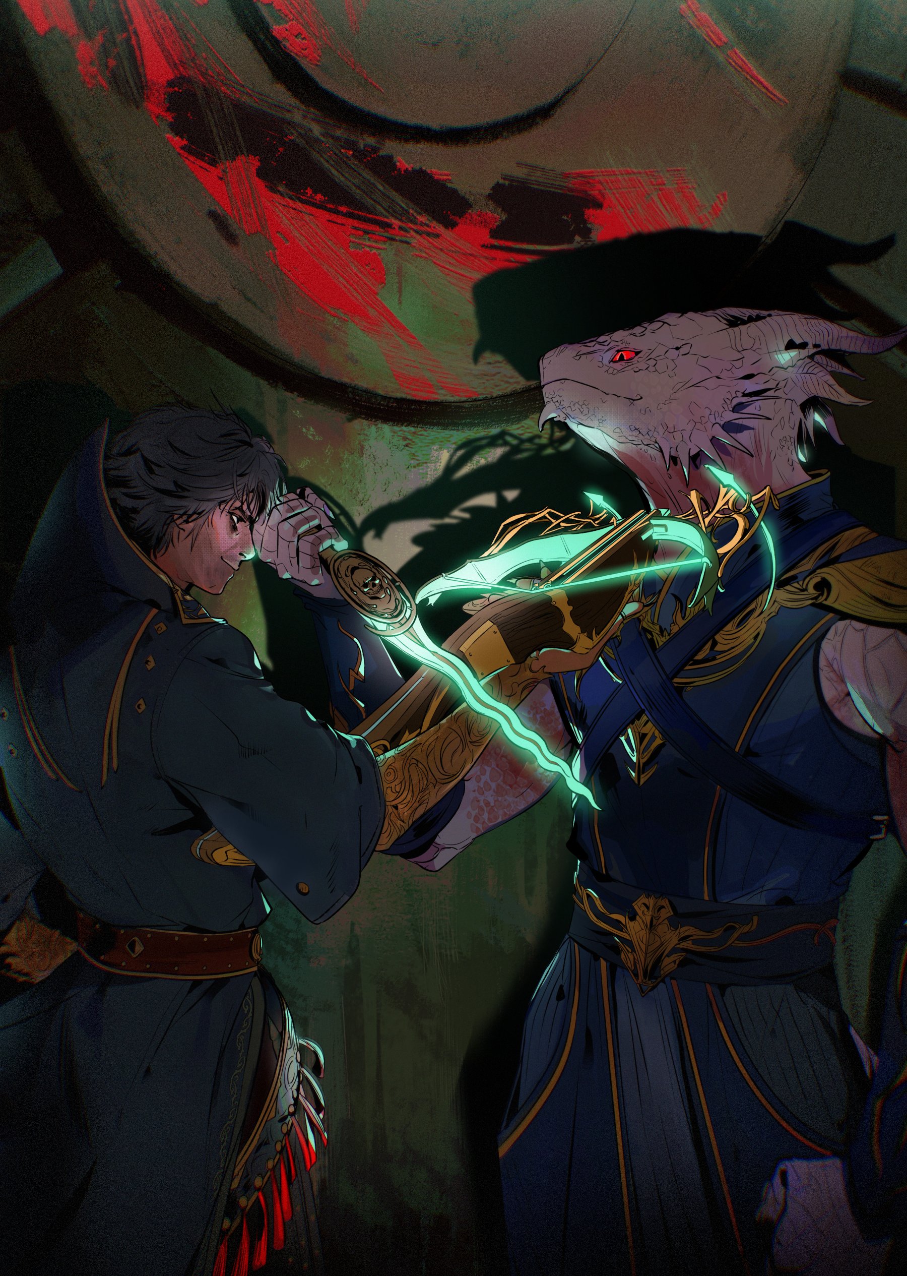 2boys absurdres baldur's_gate baldur's_gate_3 belt black_coat black_eyes black_hair blue_robe bow_(weapon) chest_harness coat collared_coat cowboy_shot crossbow dagger dragon_boy dragon_horns drop_shadow enver_gortash eye_contact from_side furry furry_male glowing glowing_weapon harness high_collar highres holding holding_crossbow holding_dagger holding_knife holding_weapon horns jt_(ynxbpwifpl42745) knife looking_at_another male_focus multiple_boys profile red_eyes robe scales short_hair smile standing the_dark_urge_(baldur's_gate) weapon
