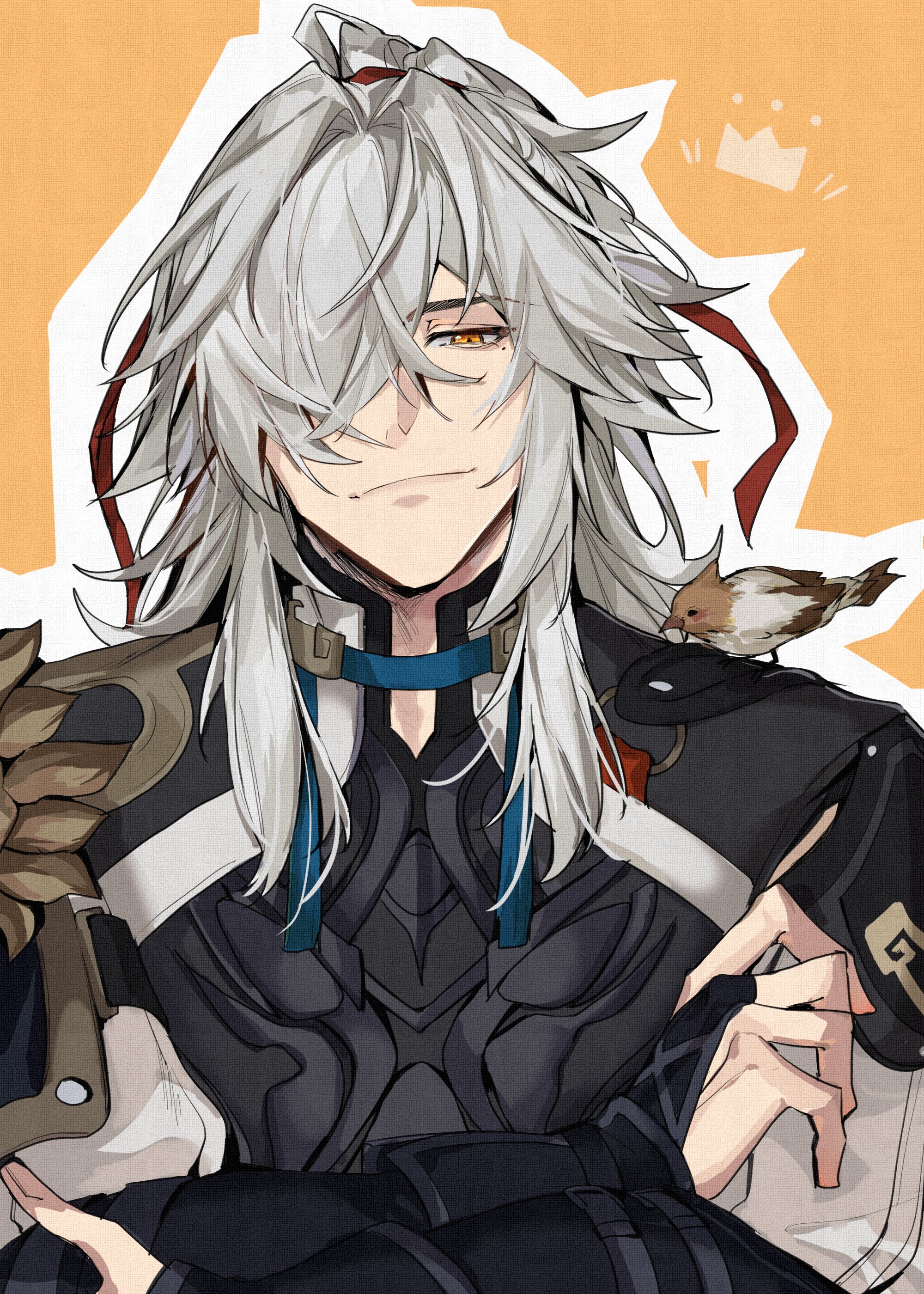 1boy absurdres animal animal_on_shoulder armlet bird bird_on_shoulder collar crossed_arms futon_(ftn_7118) grey_hair hair_between_eyes hair_over_one_eye highres honkai:_star_rail honkai_(series) jewelry jing_yuan light_smile long_hair mole mole_under_eye orange_background orange_eyes shoulder_guard sidelocks upper_body