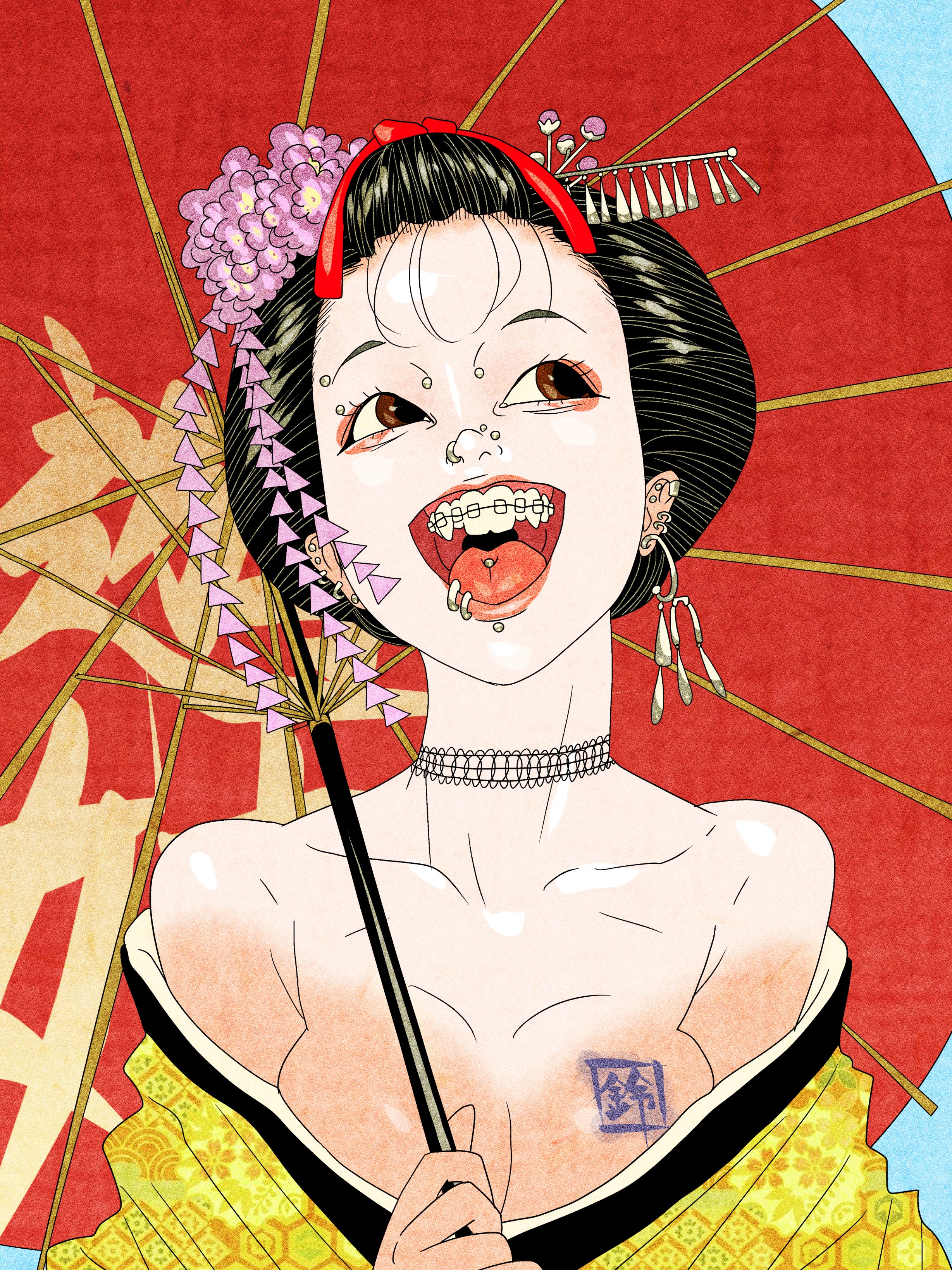 1girl absurdres bare_shoulders black_hair braces breasts brown_eyes choker earrings eyebrow_piercing face_piercing fine_art_parody floral_print floral_print_kimono hair_ornament highres inkan japanese_clothes jewelry kimono lip_piercing looking_to_the_side loose_clothes loose_kimono medium_breasts nihonga no_bra nose_piercing oil-paper_umbrella original parasol parody piercing print_kimono seigo_suzuki smile tongue_piercing umbrella upper_body yellow_kimono
