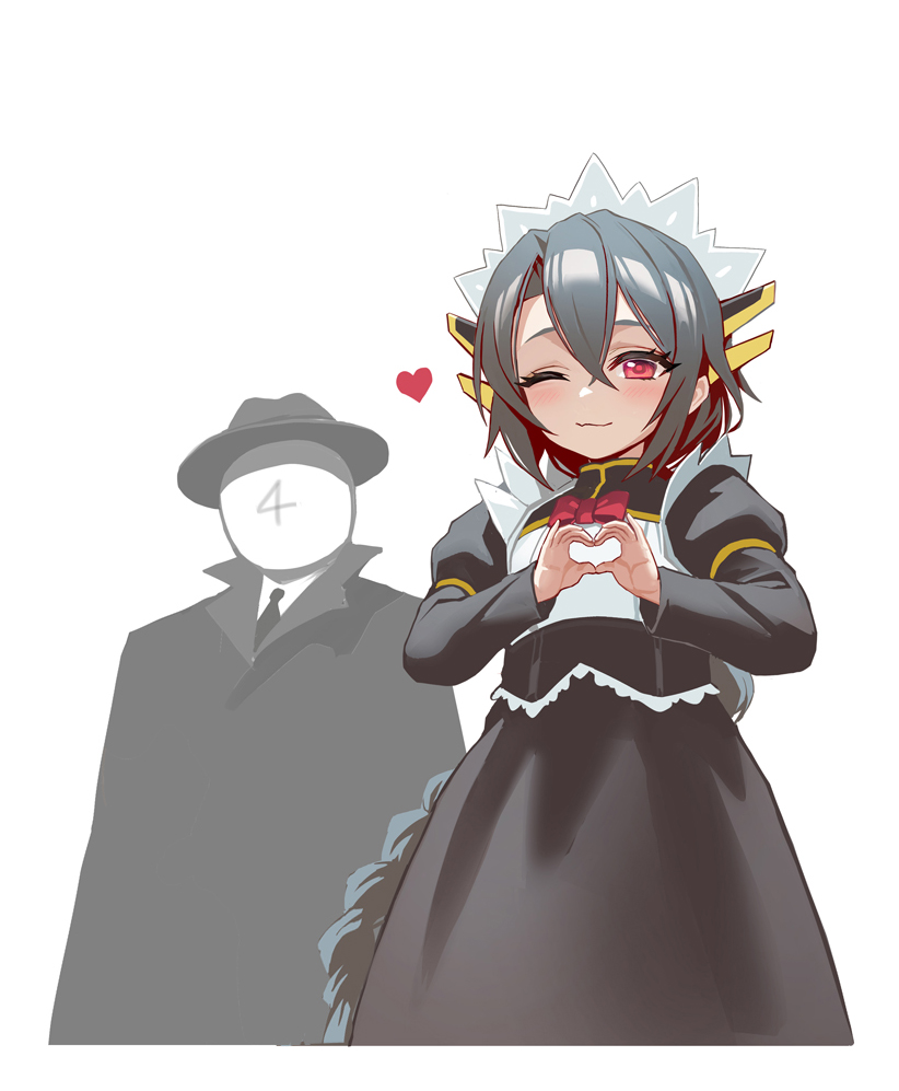 1boy 1girl adapted_costume aged_down black_hair black_wyrm_(last_origin) braid braided_ponytail coat commander_(last_origin) hat heart heart_hands last_origin maid maid_headdress mini_black_wyrm_(last_origin) necktie one_eye_closed red_eyes simple_background taesi trench_coat white_background