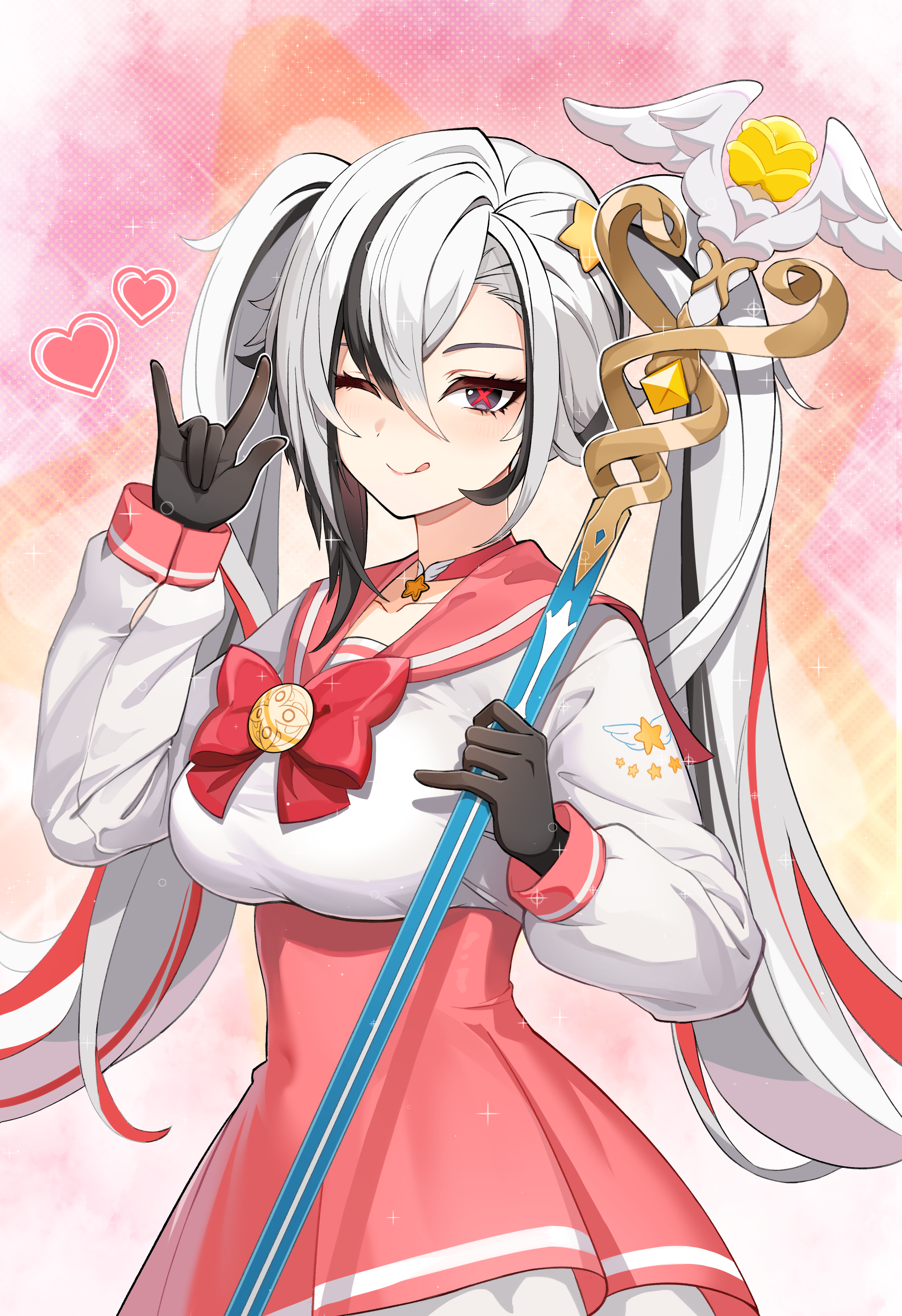 1girl ;) ;q absurdres alternate_costume alternate_hairstyle arlecchino_(genshin_impact) black_eyes black_hair black_hands bow breasts colored_extremities commentary dialogues_of_the_desert_sages_(genshin_impact) fatui_logo genshin_impact hand_up heart high-waist_skirt highres holding holding_staff long_hair long_sleeves looking_at_viewer magical_girl medium_breasts multicolored_hair one_eye_closed pink_sailor_collar pink_skirt red_bow red_hair sailor_collar shirt skirt smile solo staff streaked_hair tongue tongue_out twintails upper_body very_long_hair wellsy white_hair white_shirt