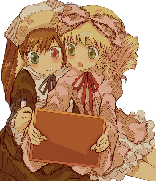2girls :o bad_id black_ribbon blonde_hair bow brown_hair chestnut_mouth dot_nose drill_hair foreshortening frilled_sleeves frills green_eyes grin hair_bow hand_up hatching_(texture) heads_together headscarf heterochromia hinaichigo holding lace-trimmed_bow lace-trimmed_sleeves lace_trim layered_sleeves linear_hatching lolita_fashion long_hair long_sleeves looking_at_another looking_down looking_to_the_side multiple_girls muted_color neck_ribbon open_mouth outstretched_arms pink_bow red_eyes red_ribbon ribbon rozen_maiden side-by-side simple_background sitting smile suiseiseki v-shaped_eyebrows white_background white_headscarf wide_sleeves yuutarou