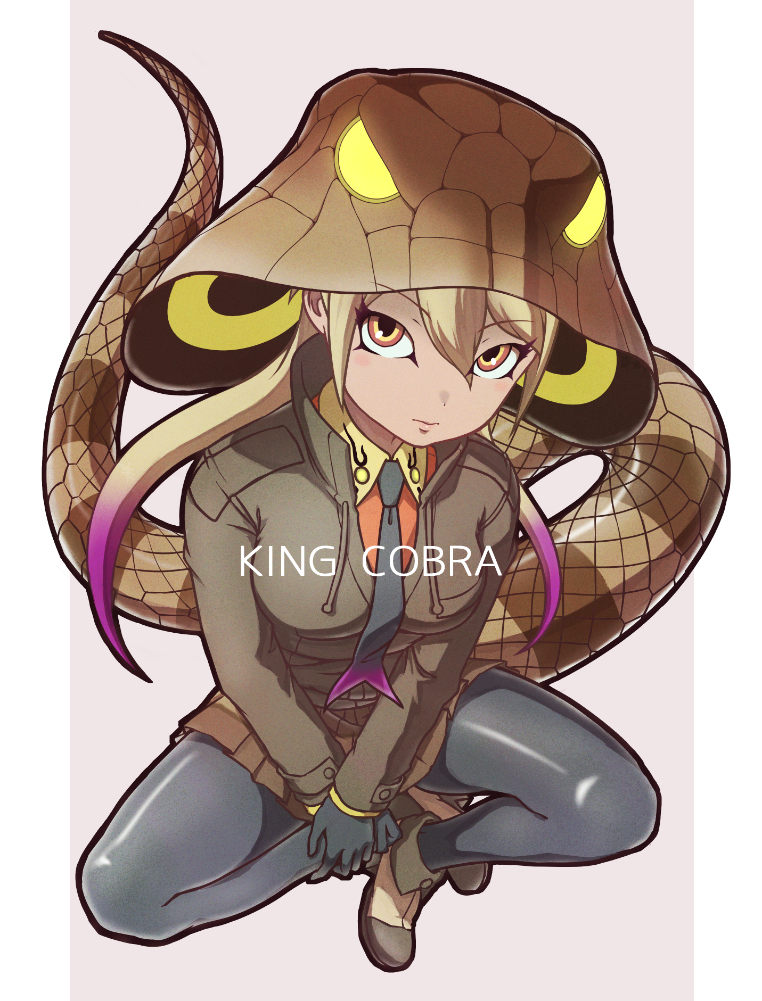 1girl animal_hood animal_print black_gloves black_necktie black_pantyhose blonde_hair brown_jacket brown_shoes brown_skirt character_name closed_mouth collared_jacket collared_shirt colored_tips commentary_request detached_hood expressionless full_body gloves glowing glowing_clothes hair_between_eyes hand_rest high_collar hood hood_up hoshino_mitsuki jacket kemono_friends kemono_friends_3 king_cobra_(kemono_friends) long_hair long_sleeves looking_at_viewer miniskirt multicolored_eyes multicolored_hair multicolored_necktie multicolored_shirt necktie orange_shirt pantyhose partially_unzipped pink_hair pink_necktie pleated_skirt print_hood red_eyes shirt shoes sitting skirt snake_girl snake_hood snake_print snake_tail solo tail tan twintails two-tone_hair very_long_tail wing_collar yellow_collar yellow_eyes zipper